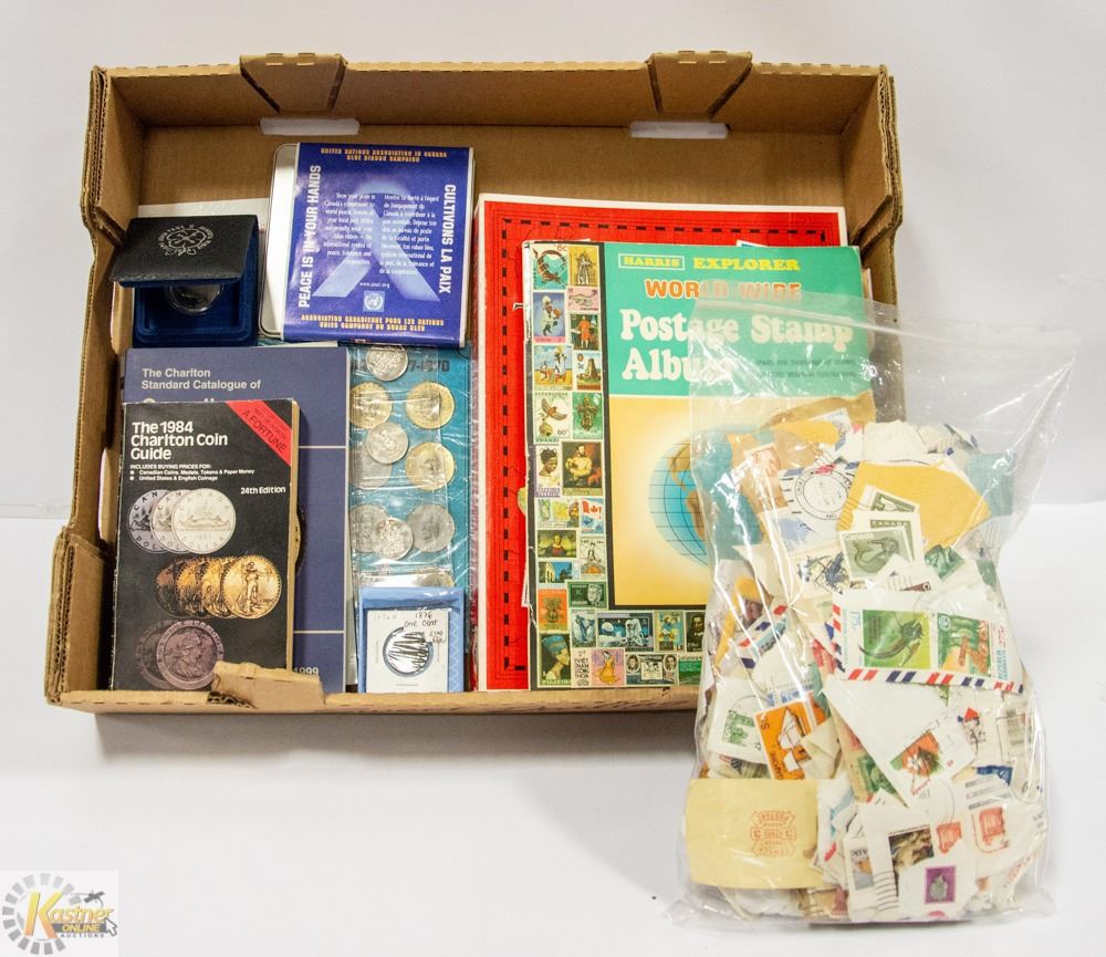 MEDALLIONS 1867-1970, CANADA DOLLAR W/(3) 50 CENT PCS, 3 CHARLTON COIN GUIDES 1994-1999, CANADA POST MILLENIUM KEEPSTAKE STAMP/COIN, (2) STAMP ALBUMS 1971/1979, BAG OF STAMPS & MORE
