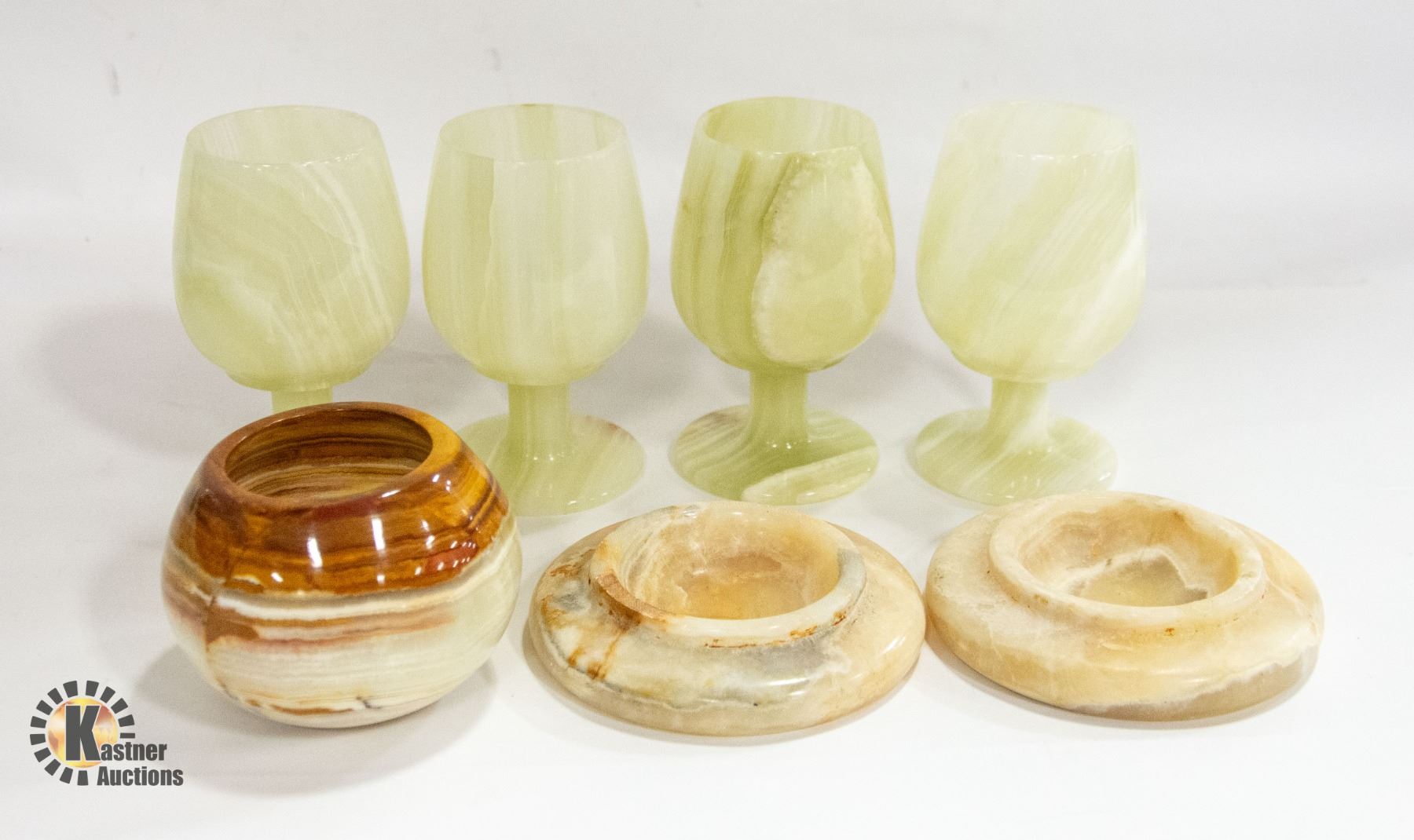 FLAT OF VARIOUS ONYX MARBLE GOBLETS & MORE