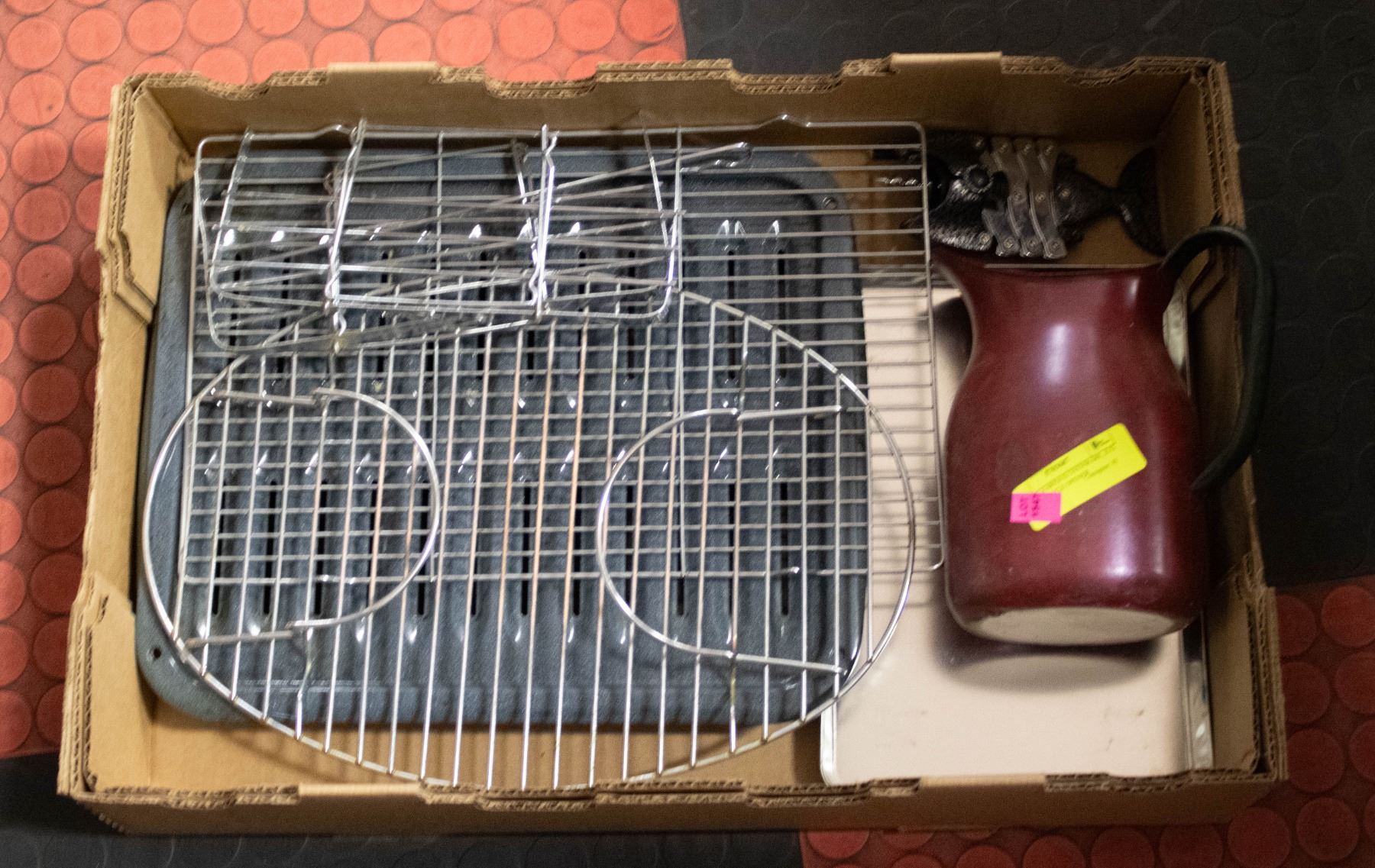 FLAT OF VARIOUS OVENWARE, JUG + WINE BOTTLE OPENER