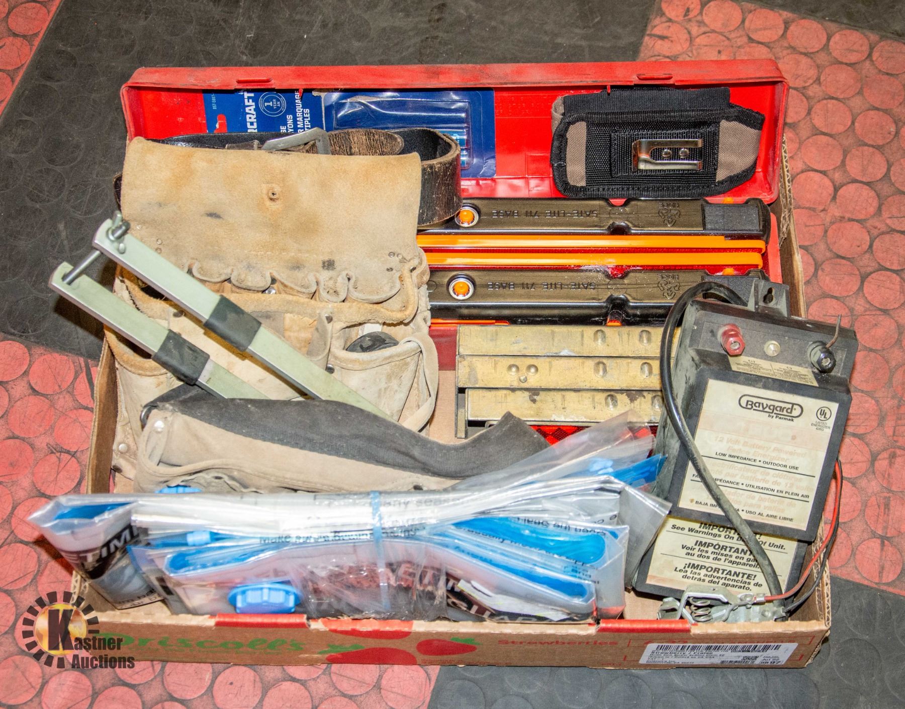 FLAT OF VARIOUS ROAD REFLECTORS, TOOL BELTS + MORE