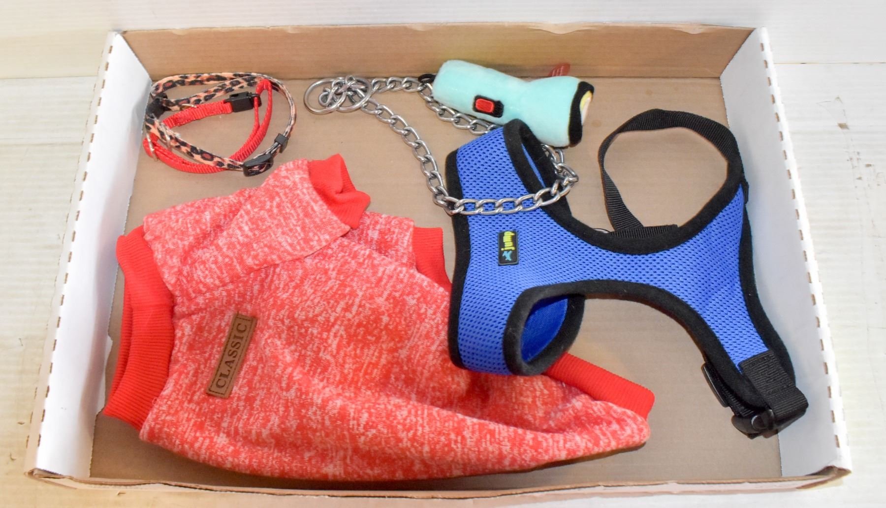 FLAT OF VARIOUS SMALL DOG ITEMS, HARNESS, SWEATER,