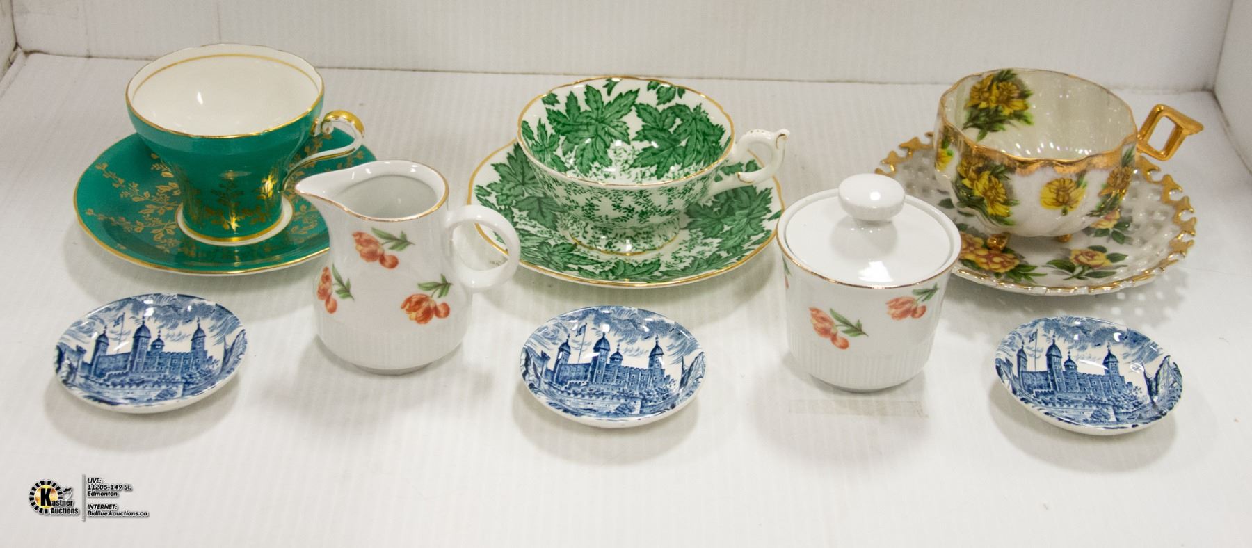 FLAT OF VARIOUS TEA CUPS, SAUCERS + MORE