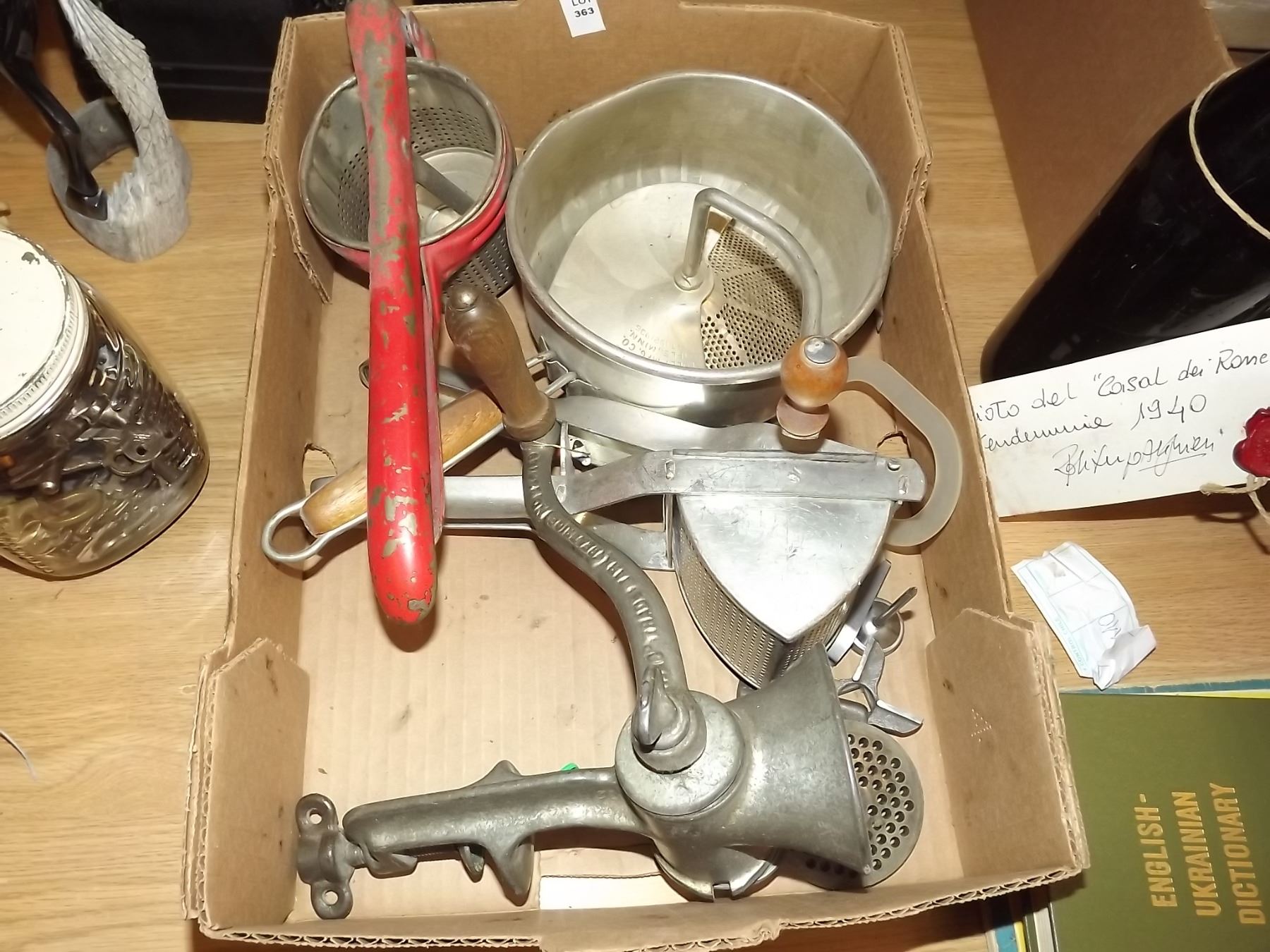 2 POTATOE RICER, FLOUR SIFTER, MEAT GRINDER