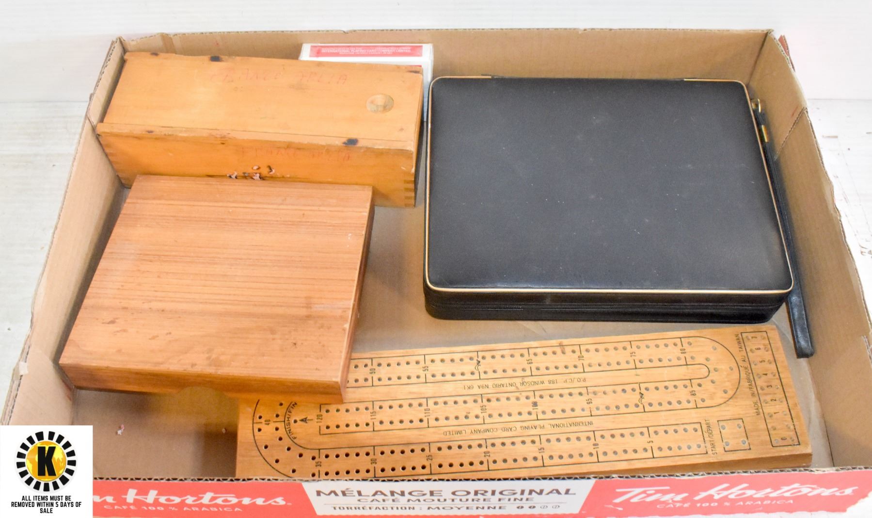 DOMINO GAME IN WOOD CASE, VINTAGE CHINESE CHECKER SET IN TEAK CASE, BACKGAMMON TRAVEL SET, CRIB BOARD AND NEW BICYCLE PLAYING CARDS