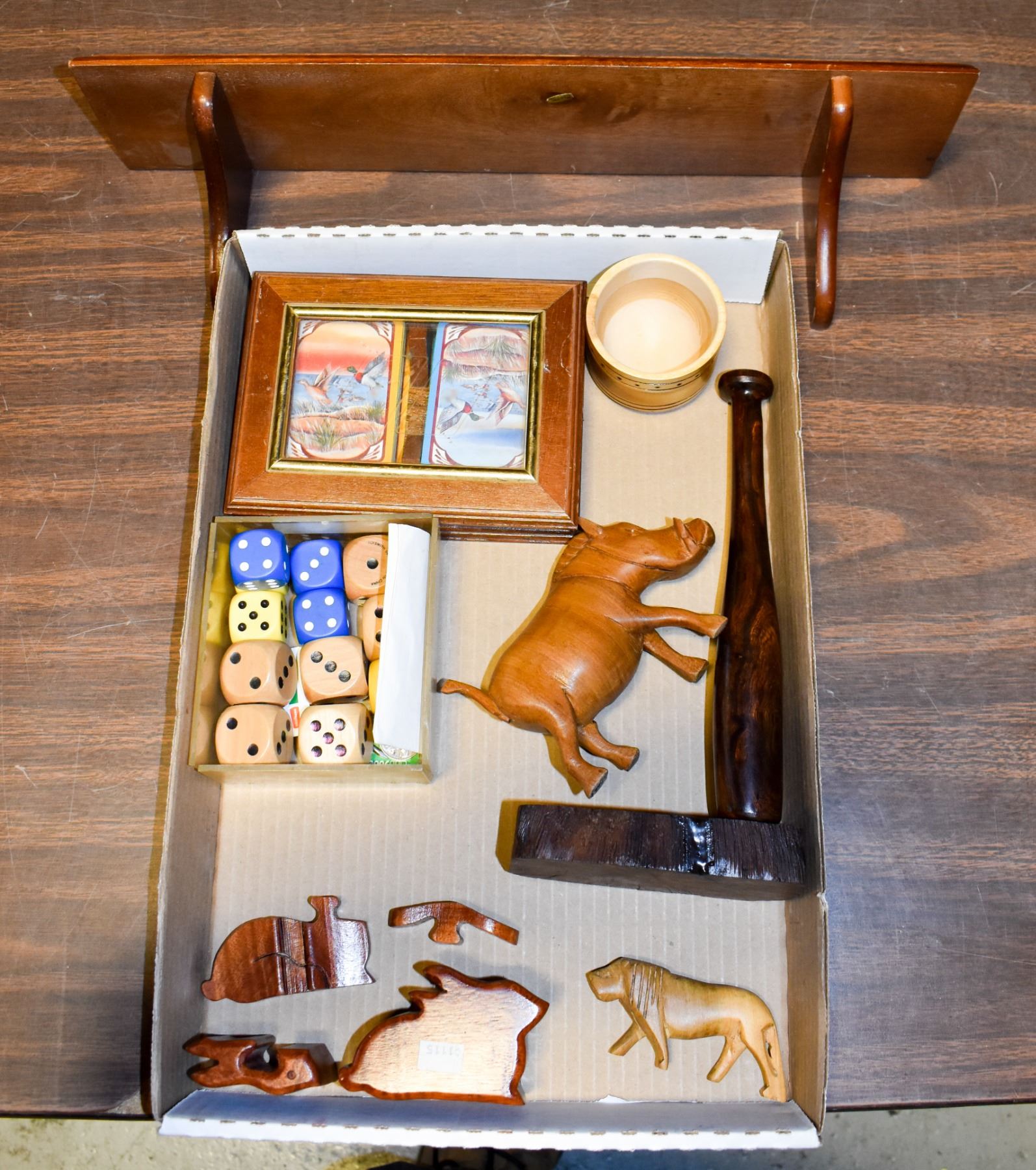 FLAT OF WOOD COLLECTIBLES, FIGURES AND MORE.