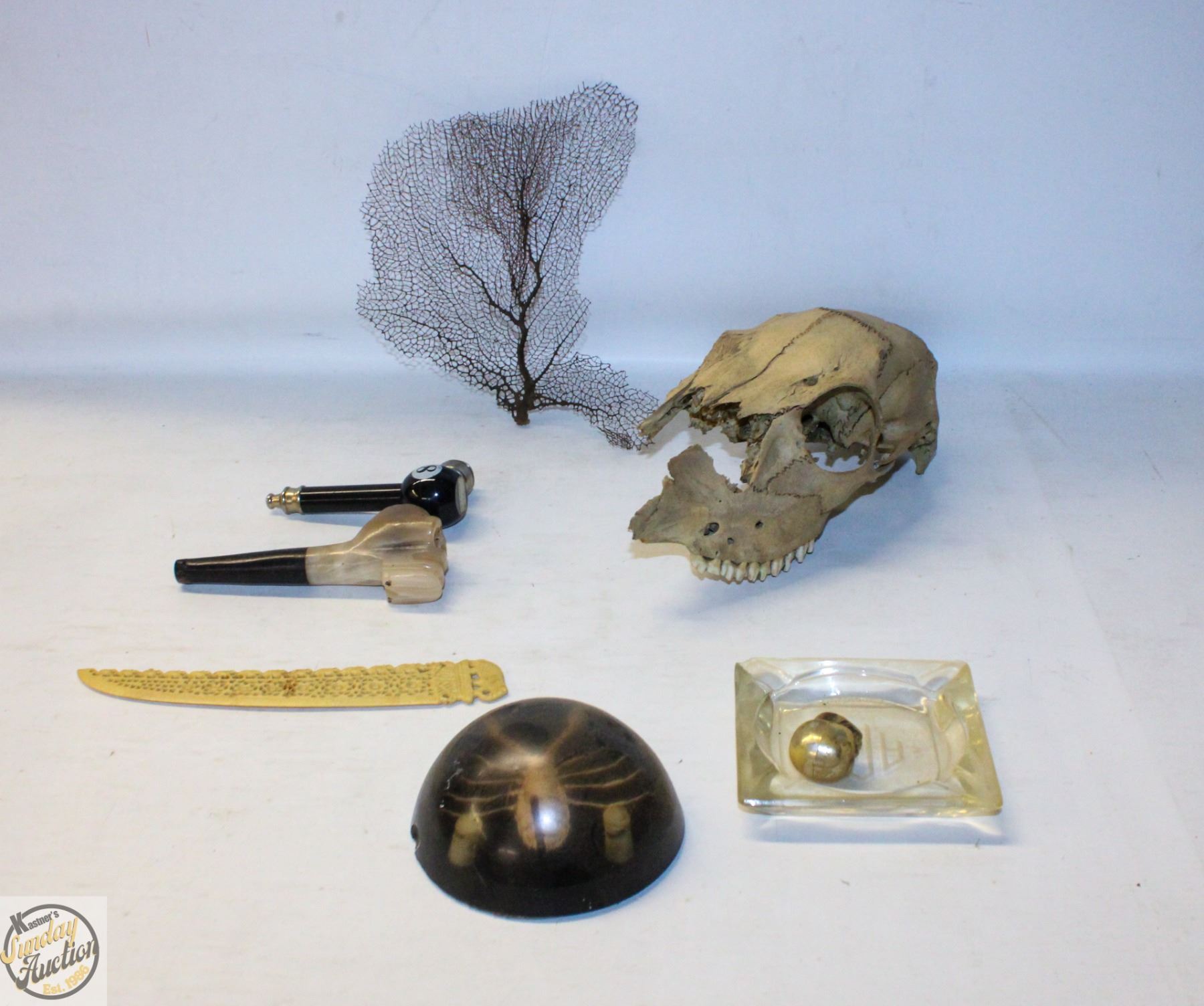 FLAT W/ SKULL, ENCASED SCORPION, ASHTRAY & MORE