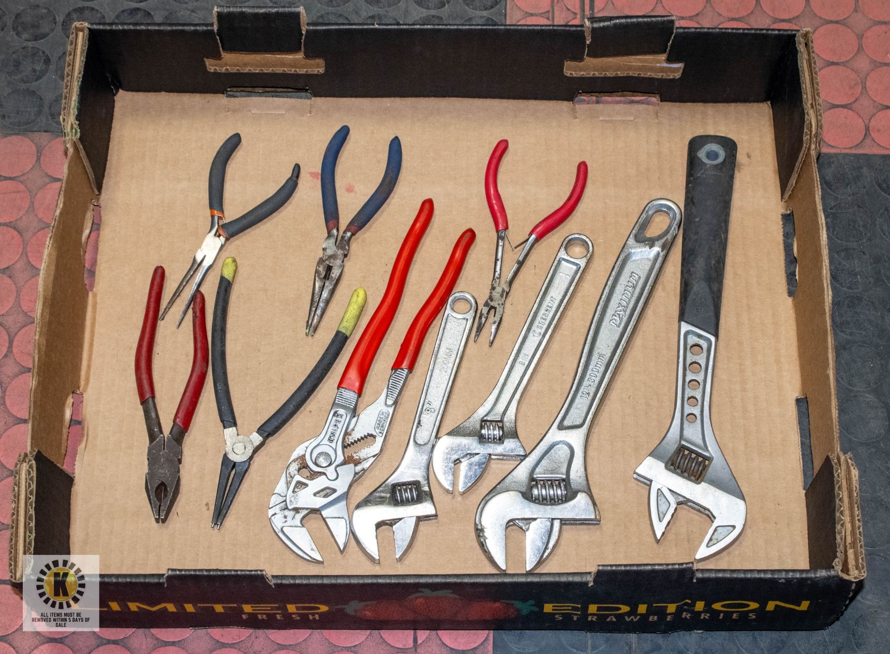 TWO X 12" CRESCENT WRENCHES, TWO X 8" CRESCENT, KNIPEX 12" CHANNEL LOCK, NEEDLENOSE PLIERS/CUTTERS, SQUARENOSE PLIERS/CUTTERS, CLIP PIN REMOVER **ALL ITEMS MUST BE REMOVED BY 5PM SATURDAY, APRIL 3RD 2025. ALL REMAINING ITEMS WILL BE SUBJECT TO A $6.00 PER DAY STORAGE CHARGE. ANY ITEMS REMAINING AFTER MONDAY, MAY 19TH 2025 WILL BE CONSIDERED FORFEITED. NO REFUNDS WILL BE ISSUED FOR FORFEITED ITEMS. TO SCHEDULE A PICK UP APPOINTMENT CLICK HERE