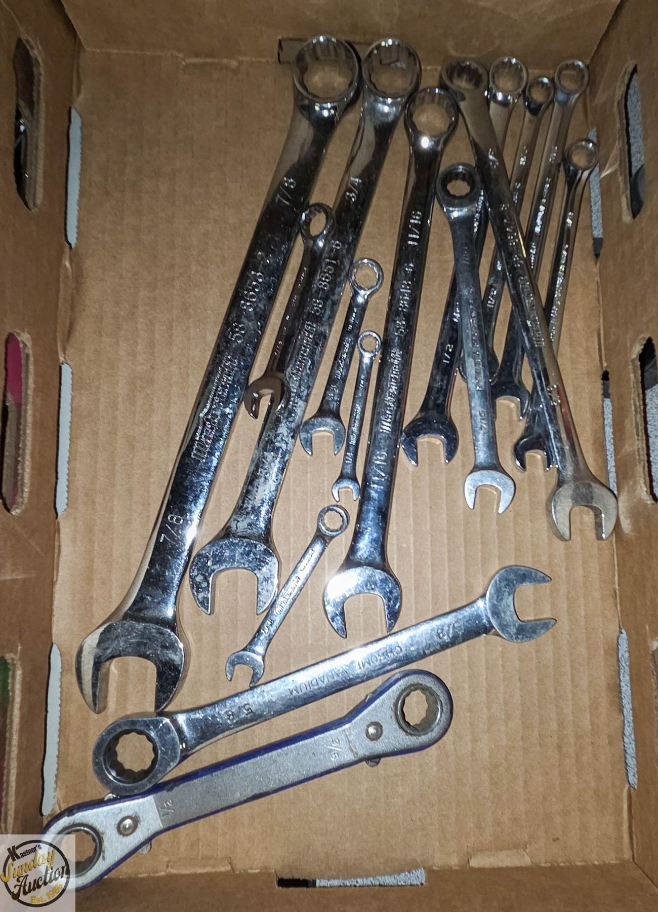 12-PIECE SET - 1/4" - 7/8' AND 3 RATCHET WRENCHES - 7/16", 1/2", 9/16" AND 5/8" **ALL ITEMS MUST BE REMOVED BY 5PM SATURDAY, MAY 31ST 2025. ALL REMAINING ITEMS WILL BE SUBJECT TO A $6.00 PER DAY STORAGE CHARGE. ANY ITEMS REMAINING AFTER MONDAY, JUNE 16TH 2025 WILL BE CONSIDERED FORFEITED. NO REFUNDS WILL BE ISSUED FOR FORFEITED ITEMS. TO SCHEDULE A PICK UP APPOINTMENT CLICK HERE