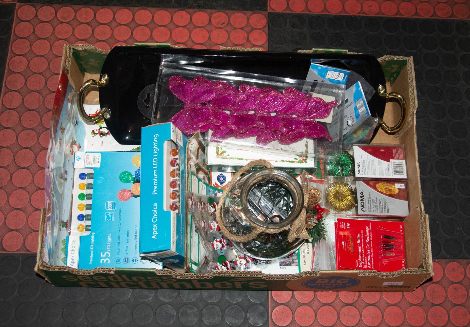 CHRISTMAS ZIP BAGS, 2 NEW NOMA LED STARRY LIGHT STRINGS, CHRISTMAS DECORATION BOWL WITH 2 STRING LIGHTS INSIDE, PLATTER, BUTTERFLY CLIP-ON TREE/PRESENT DECOR, TAGS, ETC. **ALL ITEMS MUST BE REMOVED BY 5PM SATURDAY, DECEMBER 7TH 2024. ALL REMAINING ITEMS WILL BE SUBJECT TO A $6.00 PER DAY STORAGE CHARGE. ANY ITEMS REMAINING AFTER MONDAY, DECEMBER 23RD 2024 WILL BE CONSIDERED FORFEITED. NO REFUNDS WILL BE ISSUED FOR FORFEITED ITEMS. TO SCHEDULE A PICK UP APPOINTMENT CLICK HERE