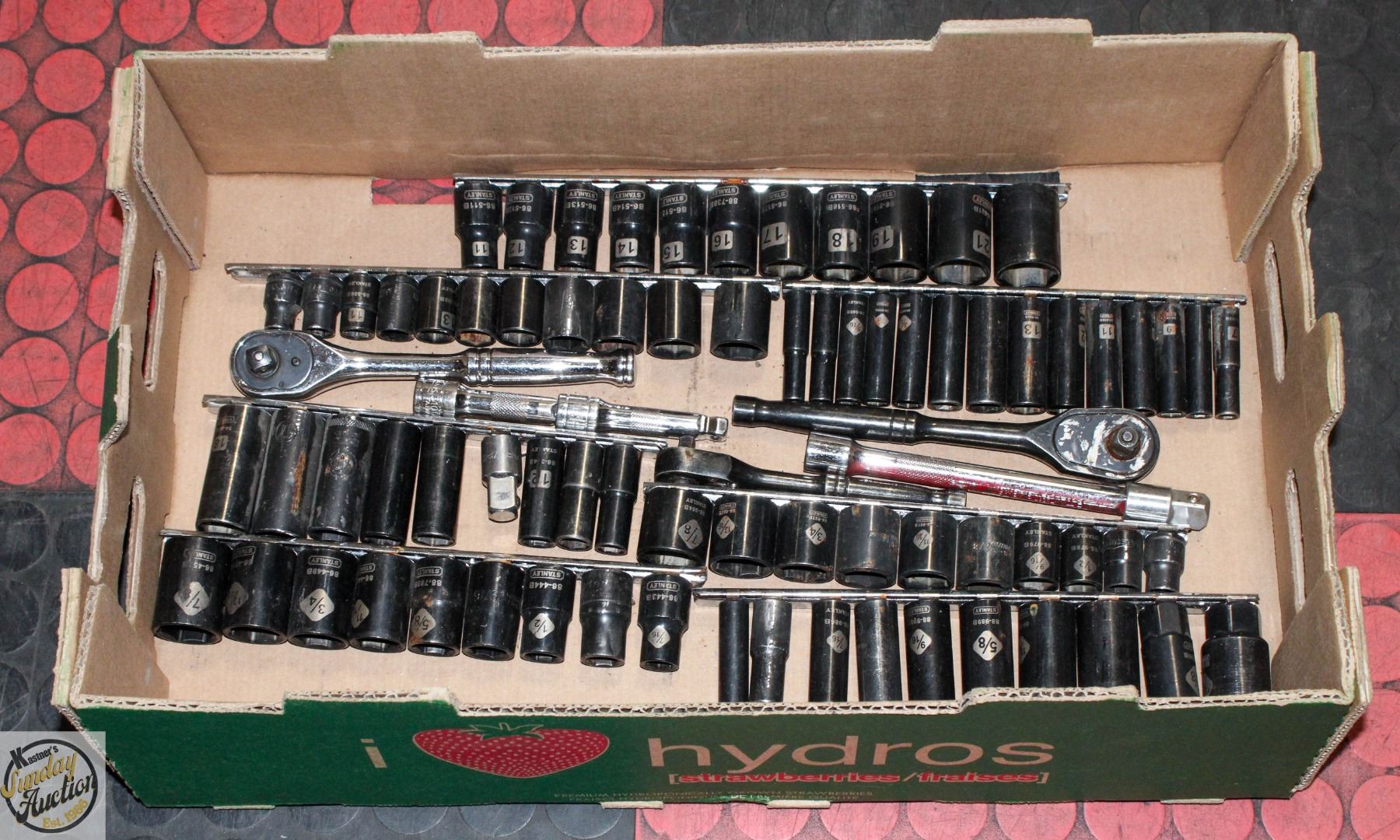 SOCKET SET INCL. SAE AND METRIC SOCKETS ON SOCKET RAILS, TWO RACHET-DRIVERS, 3 EXTENSIONS, ETC. **ALL ITEMS MUST BE REMOVED BY 5PM SATURDAY, MAY 10TH 2025. ALL REMAINING ITEMS WILL BE SUBJECT TO A $6.00 PER DAY STORAGE CHARGE. ANY ITEMS REMAINING AFTER MONDAY, MAY 26TH 2025 WILL BE CONSIDERED FORFEITED. NO REFUNDS WILL BE ISSUED FOR FORFEITED ITEMS. TO SCHEDULE A PICK UP APPOINTMENT CLICK HERE