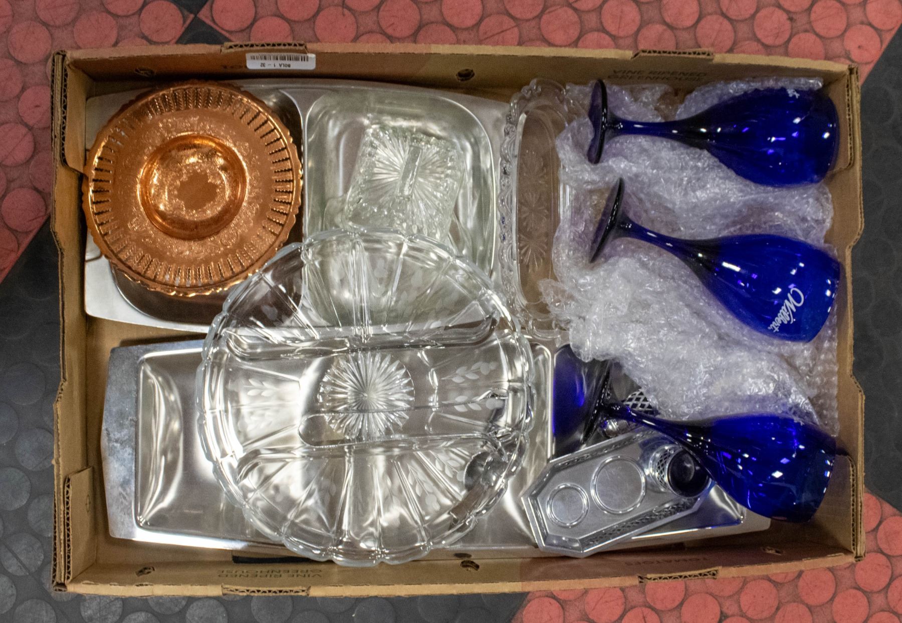 COBALT SALT & PEPPER AND TOOTHPICK HOLDER ON TRAY SET, 2 METAL FOOD TRAYS (1-2 SECTION AND 1-3 SECTION), BUTTER DISH WITH LID, GLASS PLATTER, ETC. **ALL ITEMS MUST BE REMOVED BY 5PM SATURDAY, JUNE 15TH 2024. ALL REMAINING ITEMS WILL BE SUBJECT TO A $6.00 PER DAY STORAGE CHARGE. ANY ITEMS REMAINING AFTER MONDAY, JULY 1ST 2024 WILL BE CONSIDERED FORFEITED. NO REFUNDS WILL BE ISSUED FOR FORFEITED ITEMS. TO SCHEDULE A PICK UP APPOINTMENT CLICK HERE