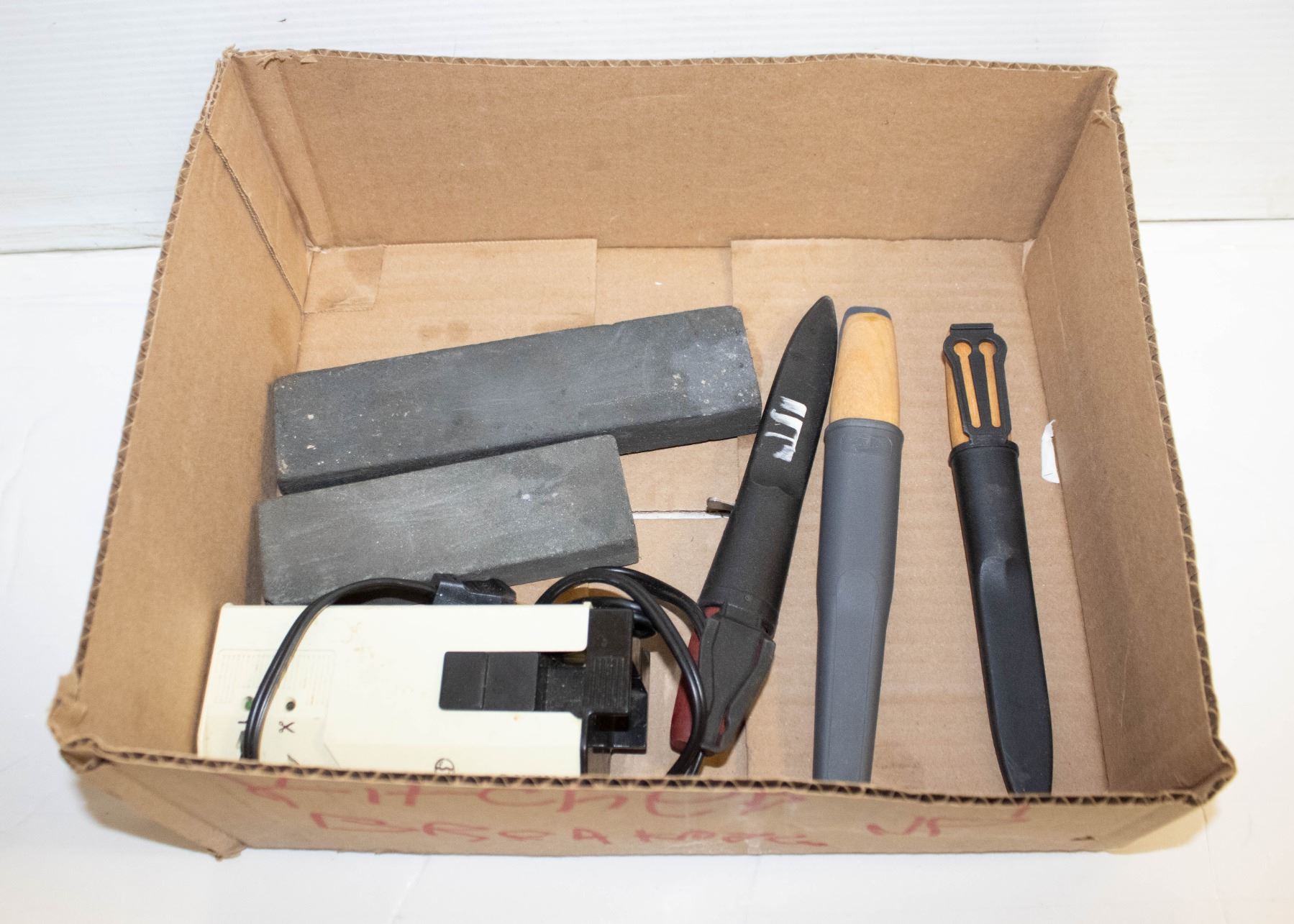WITH SHEATHS - TWO HONING STONES AND PHILIPS ELECTRIC KNIFE SHARPENER **ALL ITEMS MUST BE REMOVED BY 5PM SATURDAY, MARCH 16TH 2024. ALL REMAINING ITEMS WILL BE SUBJECT TO A $6.00 PER DAY STORAGE CHARGE. ANY ITEMS REMAINING AFTER MONDAY, APRIL 8TH, 2023 WILL BE CONSIDERED FORFEITED. NO REFUNDS WILL BE ISSUED FOR FORFEITED ITEMS. TO SCHEDULE A PICK UP APPOINTMENT CLICK HERE