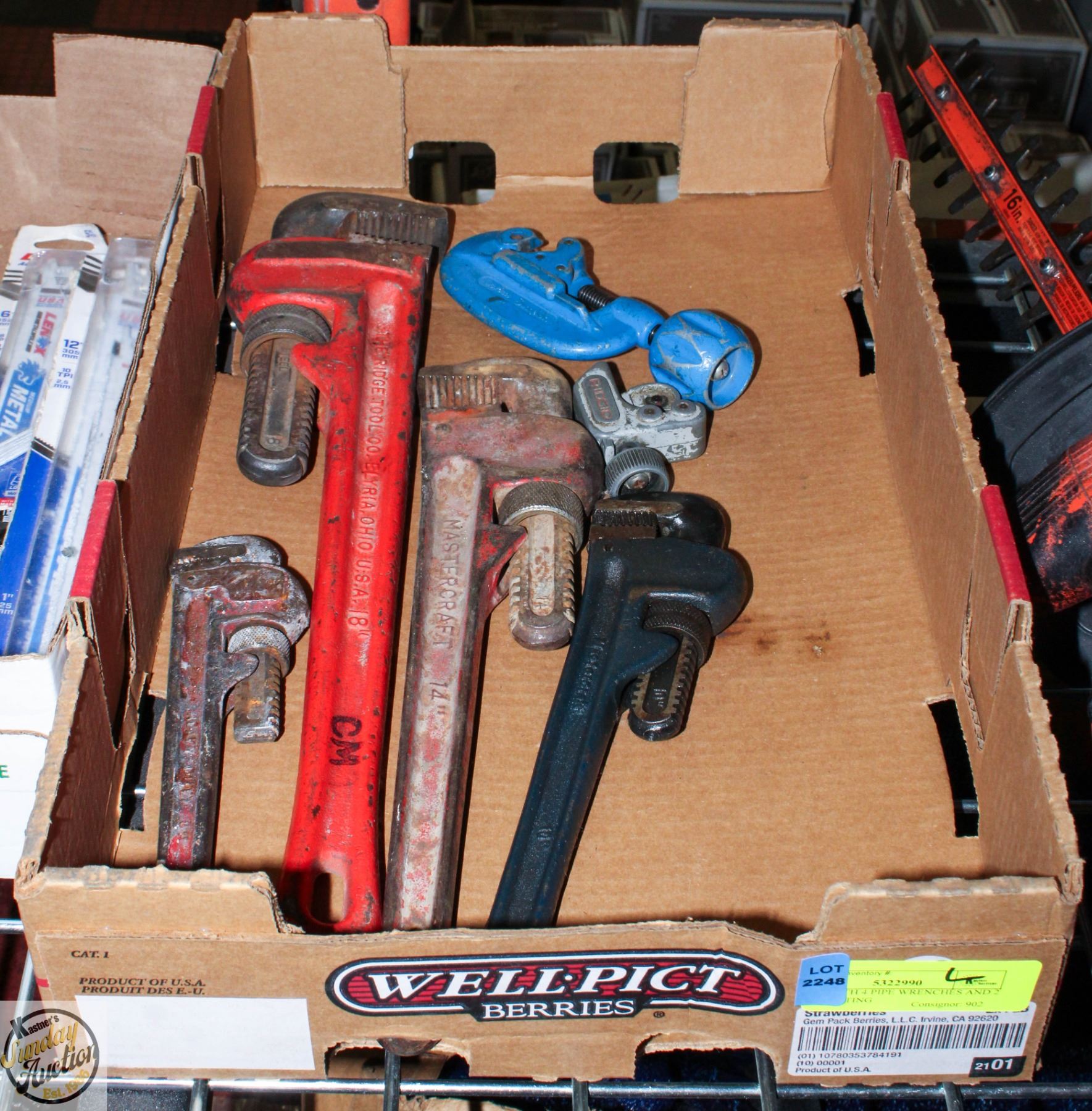 TOOLS INCL. 8", 10", 14" AND 18" PIPE WRENCHES, RIDGID AND SWAGELOK PIPE CUTTERS **ALL ITEMS MUST BE REMOVED BY 5PM SATURDAY, MAY 31ST 2025. ALL REMAINING ITEMS WILL BE SUBJECT TO A $6.00 PER DAY STORAGE CHARGE. ANY ITEMS REMAINING AFTER MONDAY, JUNE 16TH 2025 WILL BE CONSIDERED FORFEITED. NO REFUNDS WILL BE ISSUED FOR FORFEITED ITEMS. TO SCHEDULE A PICK UP APPOINTMENT CLICK HERE