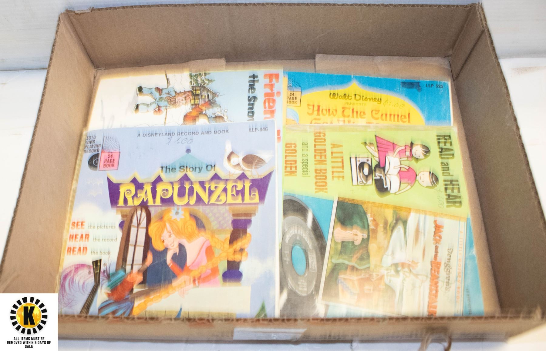 AND BOOKS INCL. DISNEY RAPUNZEL (1970), DISNEY "HOW THE CAMEL GOT IT'S HUMPS" (1968), LITTLE GOLDEN BOOK JACK AND THE BEAN STALK (1956), PETER PAN RECORDS FRIENDLY THE SNOWMAN (1977)