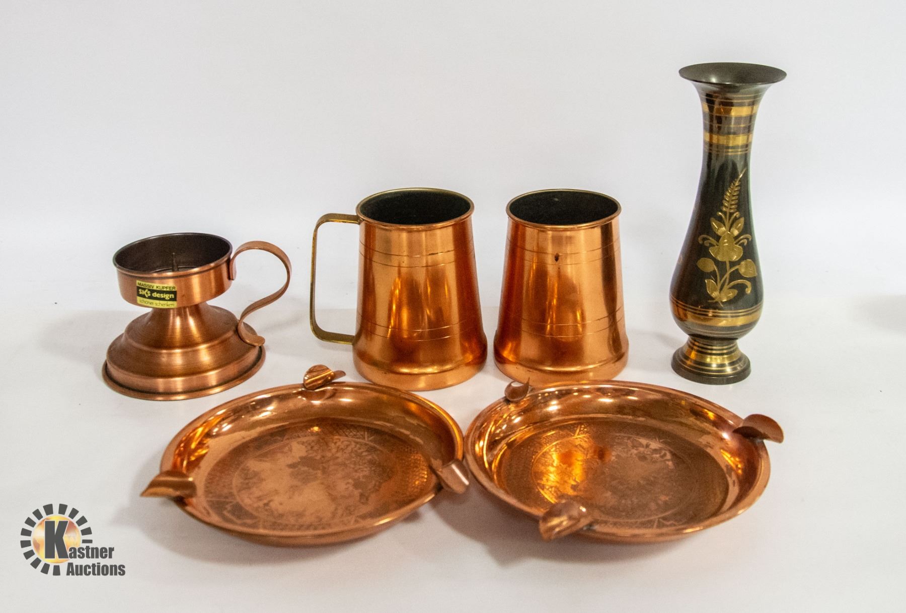 FLAT WITH 5 COPPER PIECES SOLD WITH ORNATE VASE