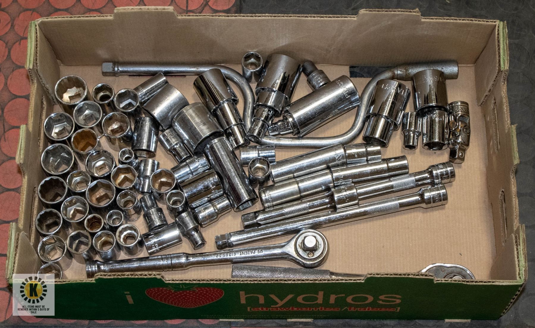 INCL. TWO 1/2" DRIVE RATCHETS, QUICK WRENCH, KNUCKLE SWIVEL, LARGE ASSORTMENT OF SAE AND METRIC SOCKETS - SHALLOW AND DEEP LONG EXTENSION AND TWO SHORT EXTENSIONS **ALL ITEMS MUST BE REMOVED BY 5PM SATURDAY, APRIL 3RD 2025. ALL REMAINING ITEMS WILL BE SUBJECT TO A $6.00 PER DAY STORAGE CHARGE. ANY ITEMS REMAINING AFTER MONDAY, MAY 19TH 2025 WILL BE CONSIDERED FORFEITED. NO REFUNDS WILL BE ISSUED FOR FORFEITED ITEMS. TO SCHEDULE A PICK UP APPOINTMENT CLICK HERE