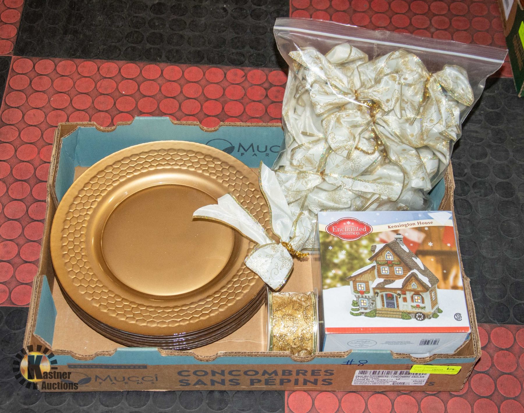 (CHAMPAGNE COLOUR), BAG OF GOLD TRIMMED CHRISTMAS TREE BOWS, GOLD RIBBON, ENCHANTED CHRISTMAS KENSINGTON HAND PAINTED LIT PORCELAIN HOUSE **ALL ITEMS MUST BE REMOVED BY 5PM SATURDAY, DECEMBER 7TH 2024. ALL REMAINING ITEMS WILL BE SUBJECT TO A $6.00 PER DAY STORAGE CHARGE. ANY ITEMS REMAINING AFTER MONDAY, DECEMBER 23RD 2024 WILL BE CONSIDERED FORFEITED. NO REFUNDS WILL BE ISSUED FOR FORFEITED ITEMS. TO SCHEDULE A PICK UP APPOINTMENT CLICK HERE