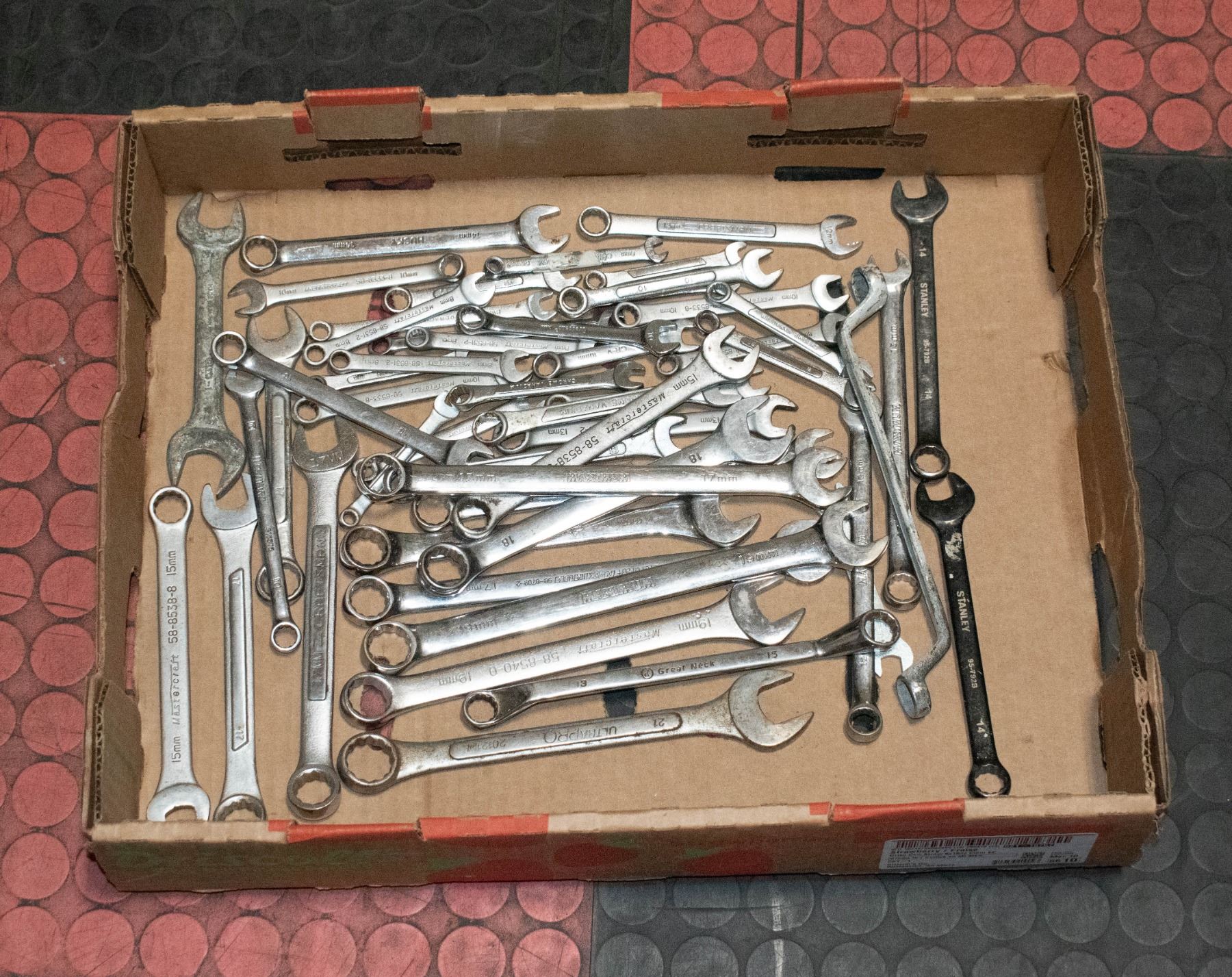 WRENCHES - 7 MM - 21 MM, VARIETY OF BRAND NAMES AND TYPE OF WRENCHES, DUPLICATES OF MOST SIZES **ALL ITEMS MUST BE REMOVED BY 5PM SATURDAY, MAY 10TH 2025. ALL REMAINING ITEMS WILL BE SUBJECT TO A $6.00 PER DAY STORAGE CHARGE. ANY ITEMS REMAINING AFTER MONDAY, MAY 26TH 2025 WILL BE CONSIDERED FORFEITED. NO REFUNDS WILL BE ISSUED FOR FORFEITED ITEMS. TO SCHEDULE A PICK UP APPOINTMENT CLICK HERE