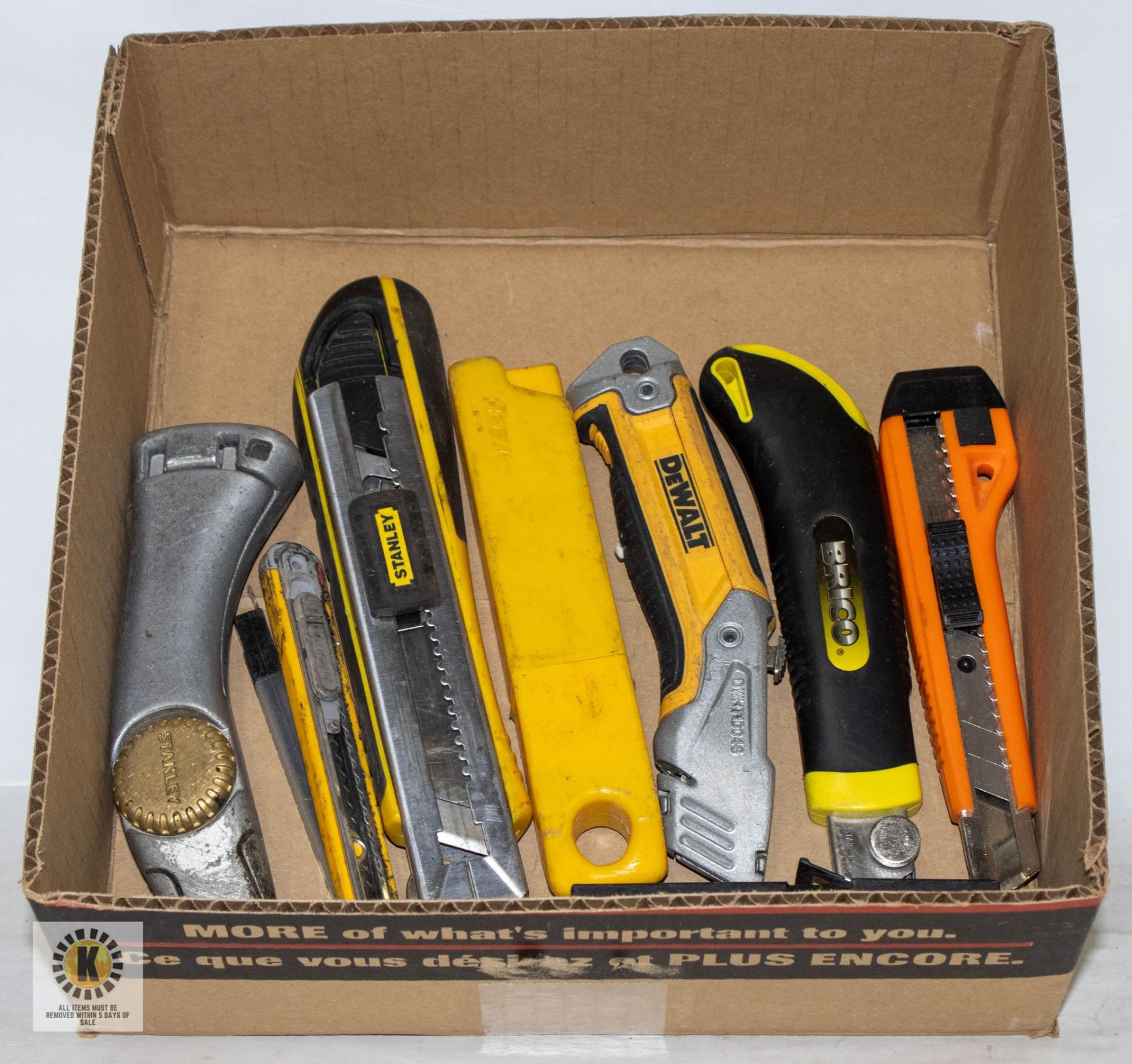 BLADES INCL. STANLEY AND DEWALT, SEVERAL TYPES AND SIZES **ALL ITEMS MUST BE REMOVED BY 5PM SATURDAY, APRIL 3RD 2025. ALL REMAINING ITEMS WILL BE SUBJECT TO A $6.00 PER DAY STORAGE CHARGE. ANY ITEMS REMAINING AFTER MONDAY, MAY 19TH 2025 WILL BE CONSIDERED FORFEITED. NO REFUNDS WILL BE ISSUED FOR FORFEITED ITEMS. TO SCHEDULE A PICK UP APPOINTMENT CLICK HERE