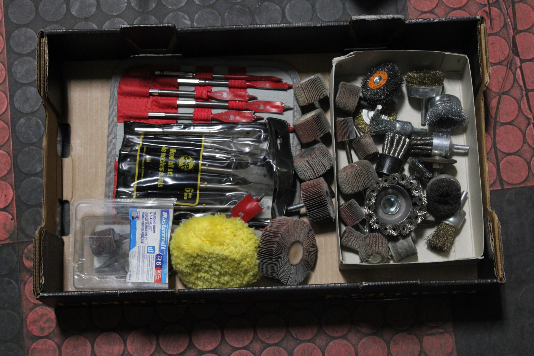 ACCESSORIES INCL. NEW SPADE BIT SETS, 11-PIECE WIRE WHEEL SET, SANDING DISCS AND FLAPPER SANDING WHEELS, BUFFER WHEEL, ETC. **ALL ITEMS MUST BE REMOVED BY 5PM SATURDAY, APRIL 5TH 2025. ALL REMAINING ITEMS WILL BE SUBJECT TO A $6.00 PER DAY STORAGE CHARGE. ANY ITEMS REMAINING AFTER MONDAY, APRIL 21ST 2025 WILL BE CONSIDERED FORFEITED. NO REFUNDS WILL BE ISSUED FOR FORFEITED ITEMS. TO SCHEDULE A PICK UP APPOINTMENT CLICK HERE