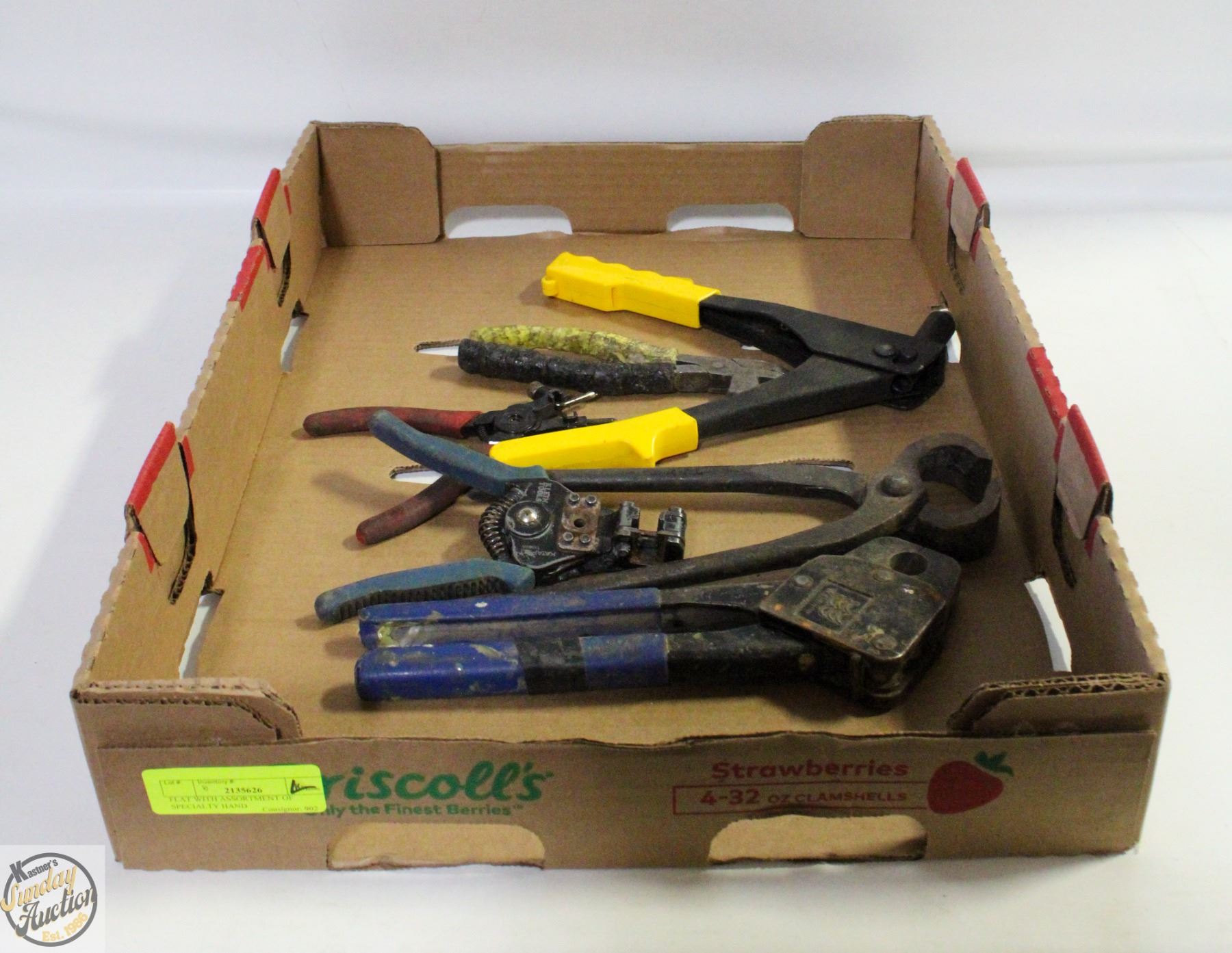 TOOLS INCL. PEX CRIMPER, RIVETER, KLEIN TOOL WIRE STRIPPERS, C-CLIP REMOVER PLIERS, 10" PINCER/NIPPING PLIERS, WIRE FENCING PLIERS **ALL ITEMS MUST BE REMOVED BY 5PM SATURDAY, DECEMBER 6TH 2025. ALL REMAINING ITEMS WILL BE SUBJECT TO A $6.00 PER DAY STORAGE CHARGE. ANY ITEMS REMAINING AFTER MONDAY, DECEMBER 22ND 2025 WILL BE CONSIDERED FORFEITED. NO REFUNDS WILL BE ISSUED FOR FORFEITED ITEMS. TO SCHEDULE A PICK UP APPOINTMENT CLICK HERE