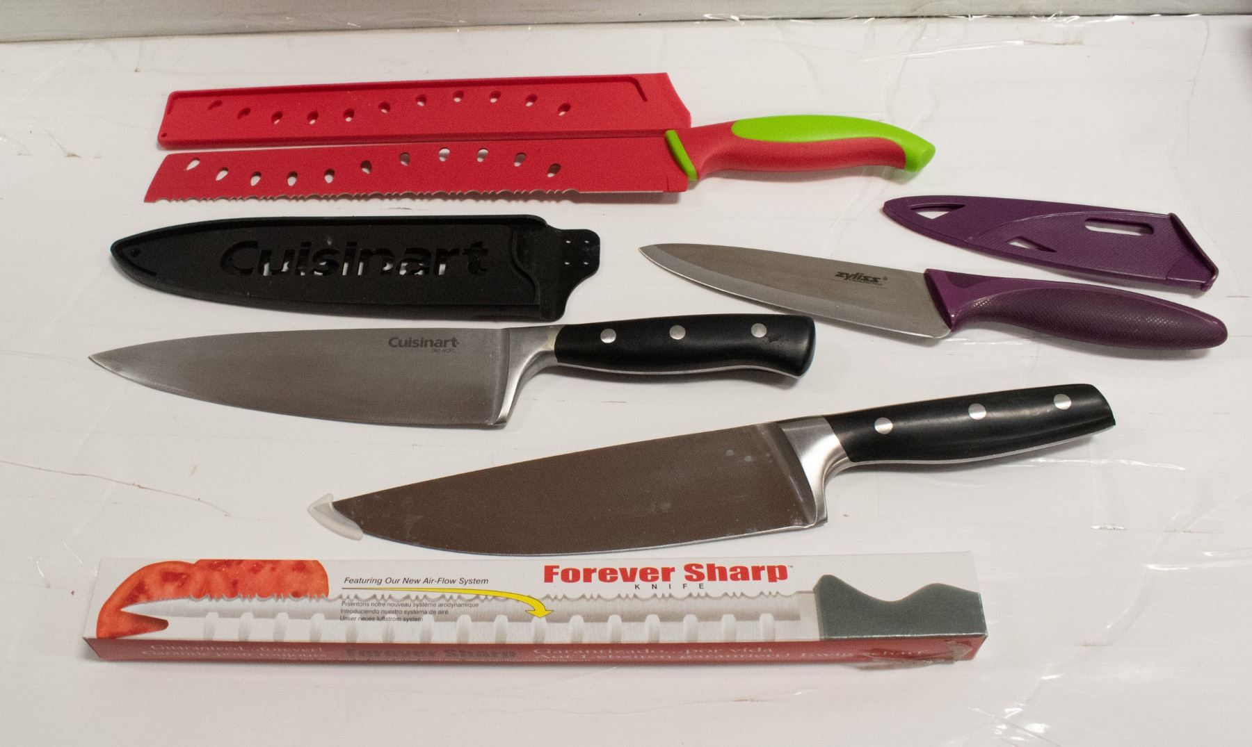 INCL. NEW JAMIE OLIVER 8"-CARVING KNIFE, NEW FOREVER SHARP SURGICAL STAINLESS STEEL SERRATED KNIFE, CUISINART 8"-KNIFE IN SHEATH, NEW LONG BREAD KNIFE IN SHEATH AND ZYLISS STAINLESS STEEL KNIFE IN SHEATH **ALL ITEMS MUST BE REMOVED BY 5PM SATURDAY, JANUARY 28TH 2023. **ALL REMAINING ITEMS WILL BE SUBJECT TO A $6.00 PER DAY STORAGE CHARGE. ANY ITEMS REMAINING AFTER MONDAY, FEBRUARY 13TH, 2023 WILL BE CONSIDERED FORFEITED. NO REFUNDS WILL BE ISSUED FOR FORFEITED ITEMS. TO SCHEDULE A PICK UP APPOINTMENT CLICK HERE
