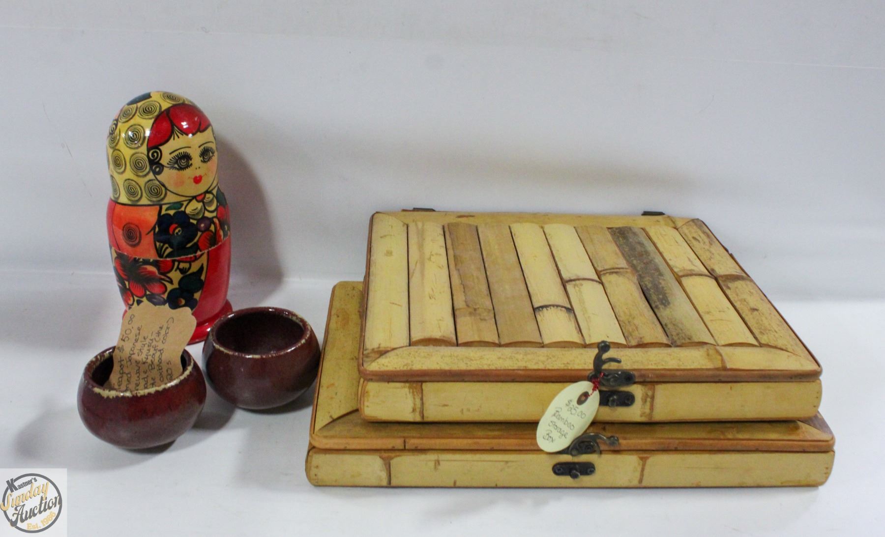 FLAT WITH BAMBOO TRINKET BOXES, CERAMIC CUPS AND