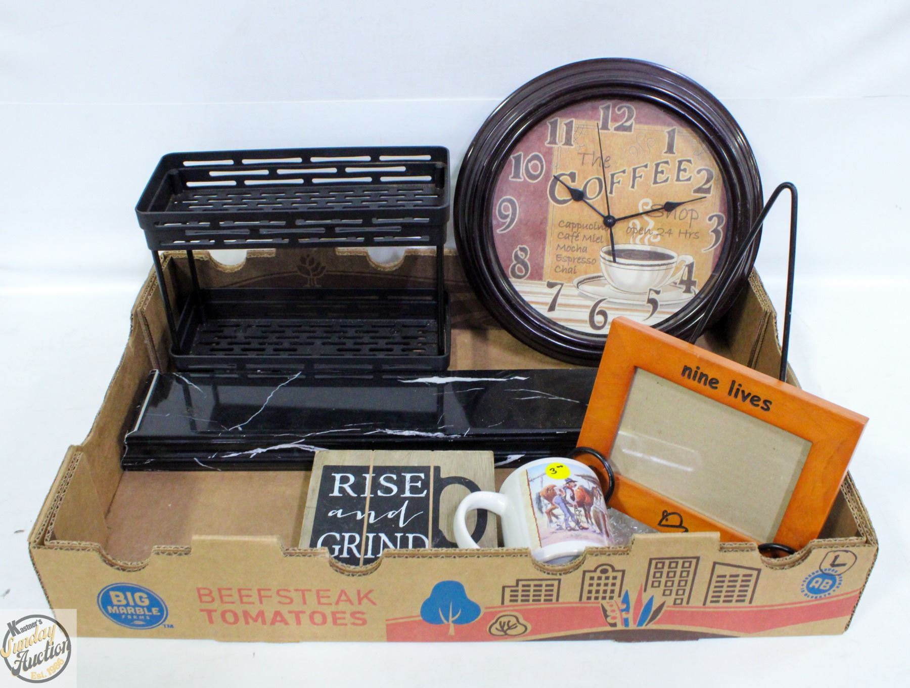 MOUNTABLE GLIDING SPICE RACK, RISE AND GRIND DECOR, THE COFFEE SHOP CLOCK, "I'M NOT OLD…JUST WELL BROKE IN!" COFFEE CUP, ETC. **ALL ITEMS MUST BE REMOVED BY 5PM SATURDAY, OCTOBER 4TH 2025. ALL REMAINING ITEMS WILL BE SUBJECT TO A $6.00 PER DAY STORAGE CHARGE. ANY ITEMS REMAINING AFTER MONDAY, OCTOBER 20TH 2025 WILL BE CONSIDERED FORFEITED. NO REFUNDS WILL BE ISSUED FOR FORFEITED ITEMS. TO SCHEDULE A PICK UP APPOINTMENT CLICK HERE