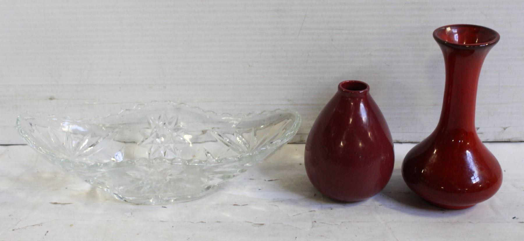 FLAT WITH BMP RED VASE, RED BUD VASE, CRYSTAL DISH