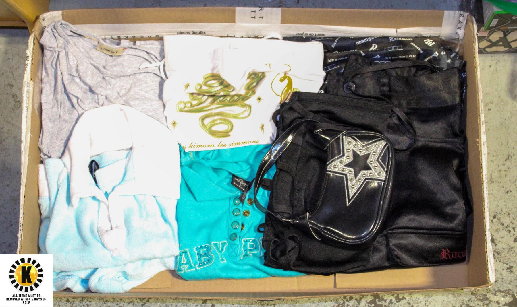 INCL. BURBERRY SHIRT (S), BABY PHAT TOP & SHORT SET (S/M), BABY PHAT HOODIE SHIRT (S), SMALL BLACK PURSE, DRESS (S), ROCAWEAR SUMMER PANTS SIZE 3/4 WITH SCARF SET, ETC.