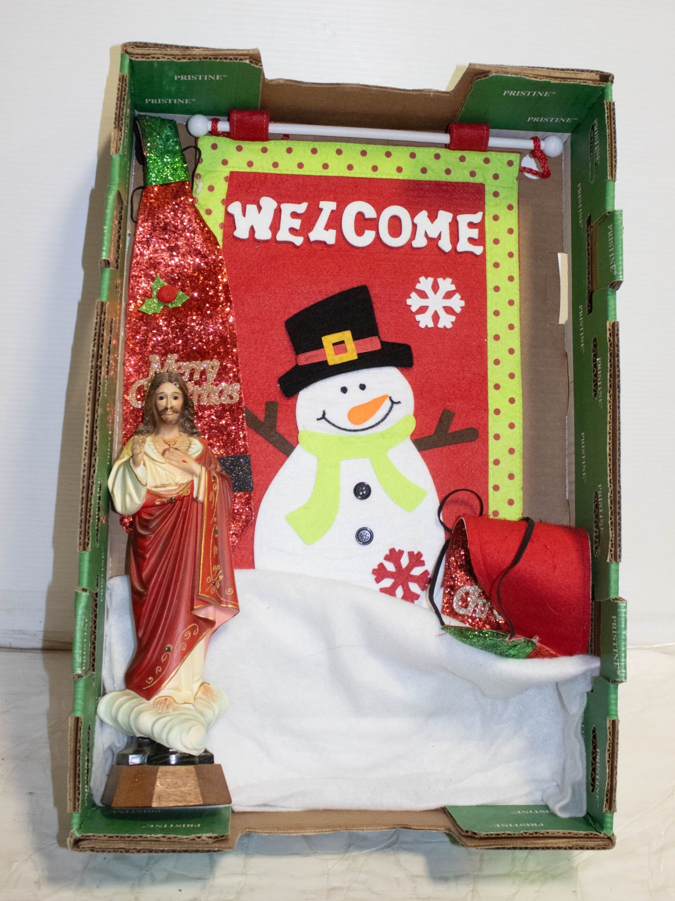 HANGING SIGN, 2 CHRISTMAS TIES AND A JESUS CHRIST FIGURINE WITH WOOD BASE **ALL ITEMS MUST BE REMOVED BY 5PM SATURDAY, DECEMBER 30TH 2023. ALL REMAINING ITEMS WILL BE SUBJECT TO A $6.00 PER DAY STORAGE CHARGE. ANY ITEMS REMAINING AFTER MONDAY, JANUARY 8TH, 2023 WILL BE CONSIDERED FORFEITED. NO REFUNDS WILL BE ISSUED FOR FORFEITED ITEMS. TO SCHEDULE A PICK UP APPOINTMENT CLICK HERE