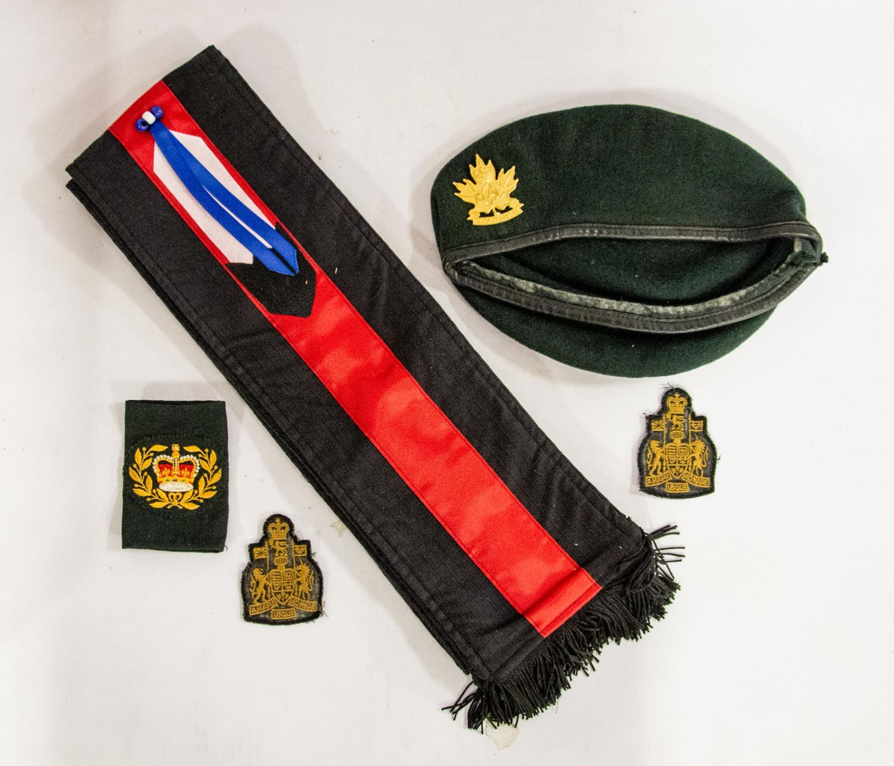 (APPROX. 1950'S) ITEMS INCL. RCAC MILITARY BERET, MILITARY SASH, MILITARY EPAULET (ARM BAND), PATCHES & PINS