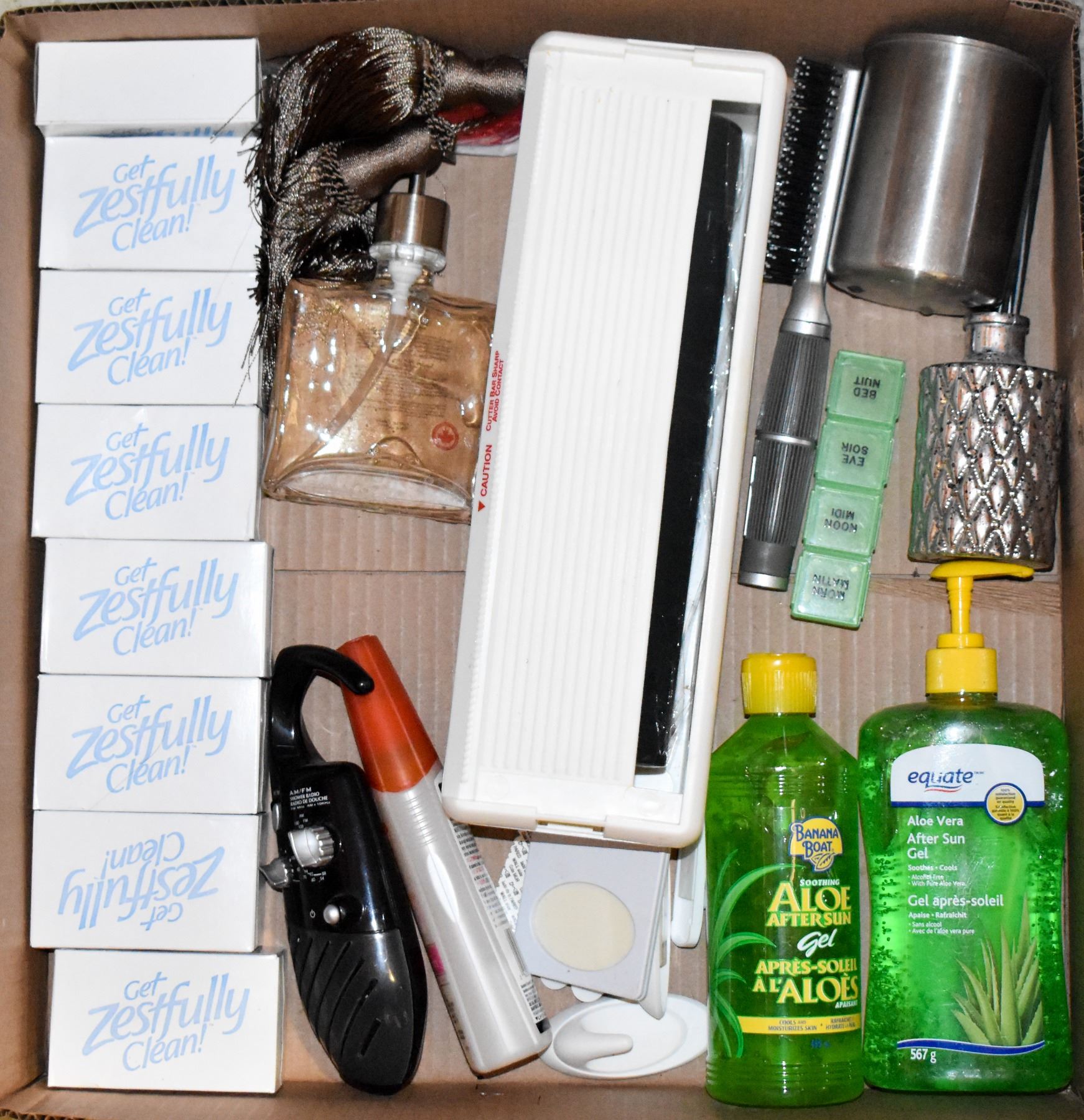 AFTER SUN GELS, OFF, HAND SOAP IN DISPENSER, ZEST SOAPS, SHOWER RADIO, EASY WRAP CONTAINER WITH ROLL OF WRAP & MORE