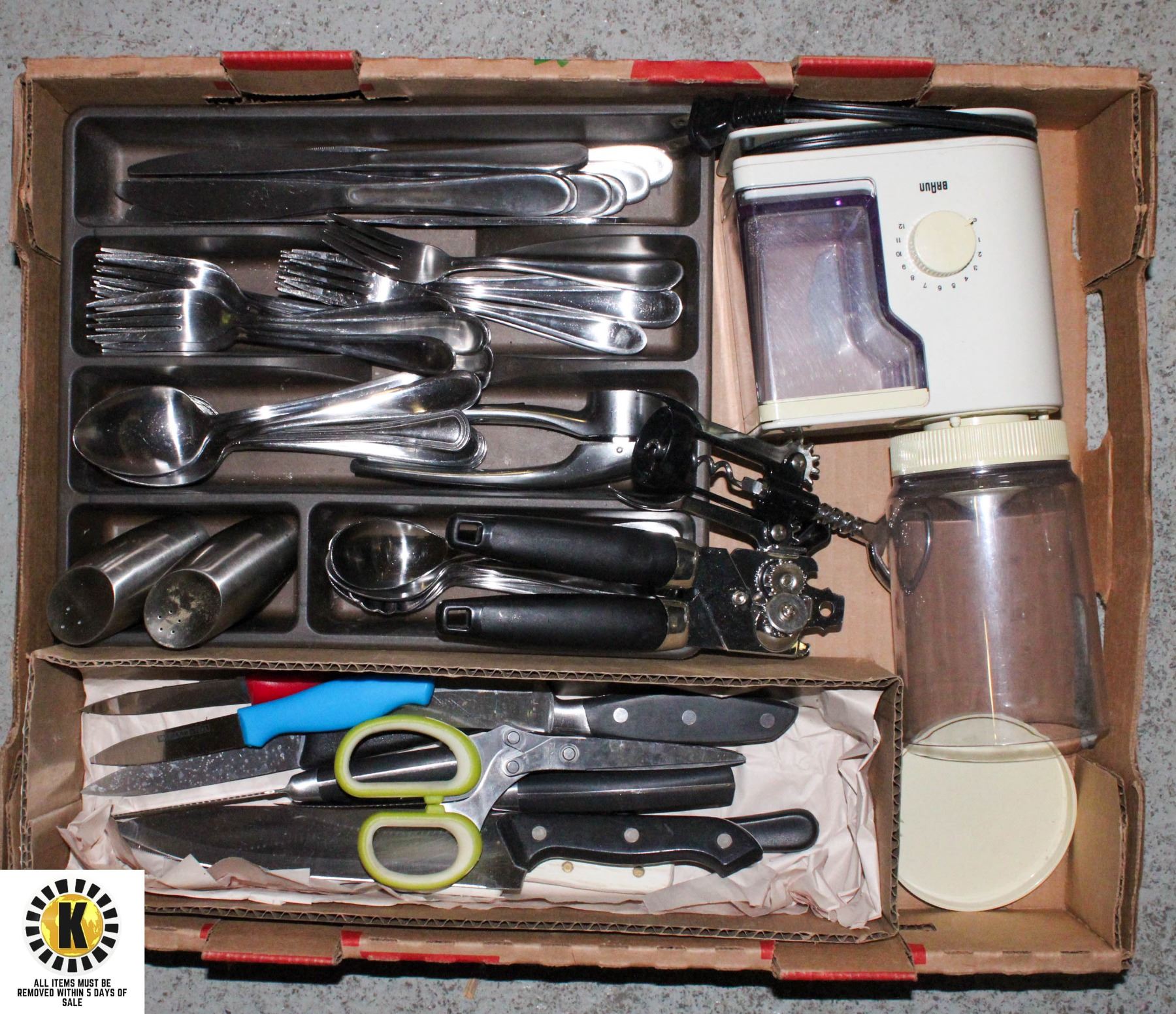 FLAT WITH KITCHEN FLATWARE, KNIVES, BRAUN