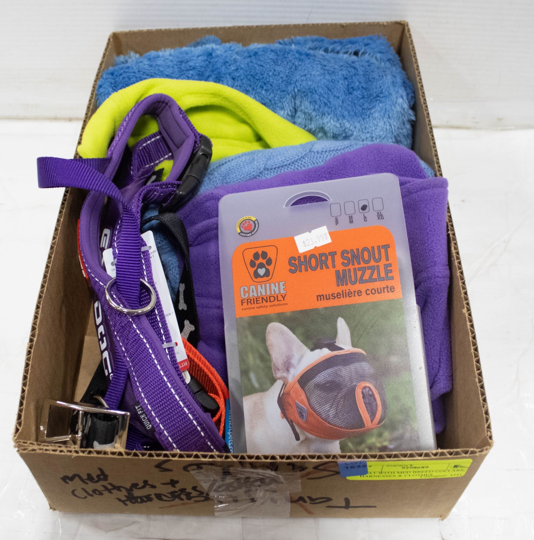 FLAT WITH MED BREED COLLARS, HARNESSES & CLOTHES