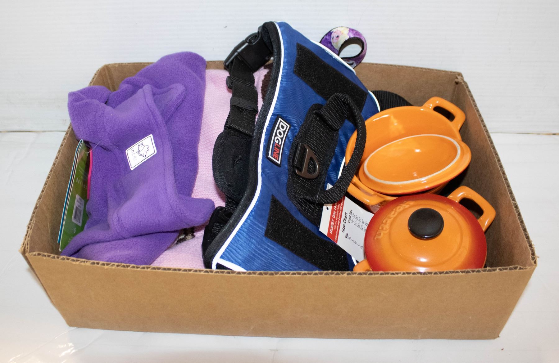 FLAT WITH MED BREED COLLARS, HARNESSES & CLOTHES