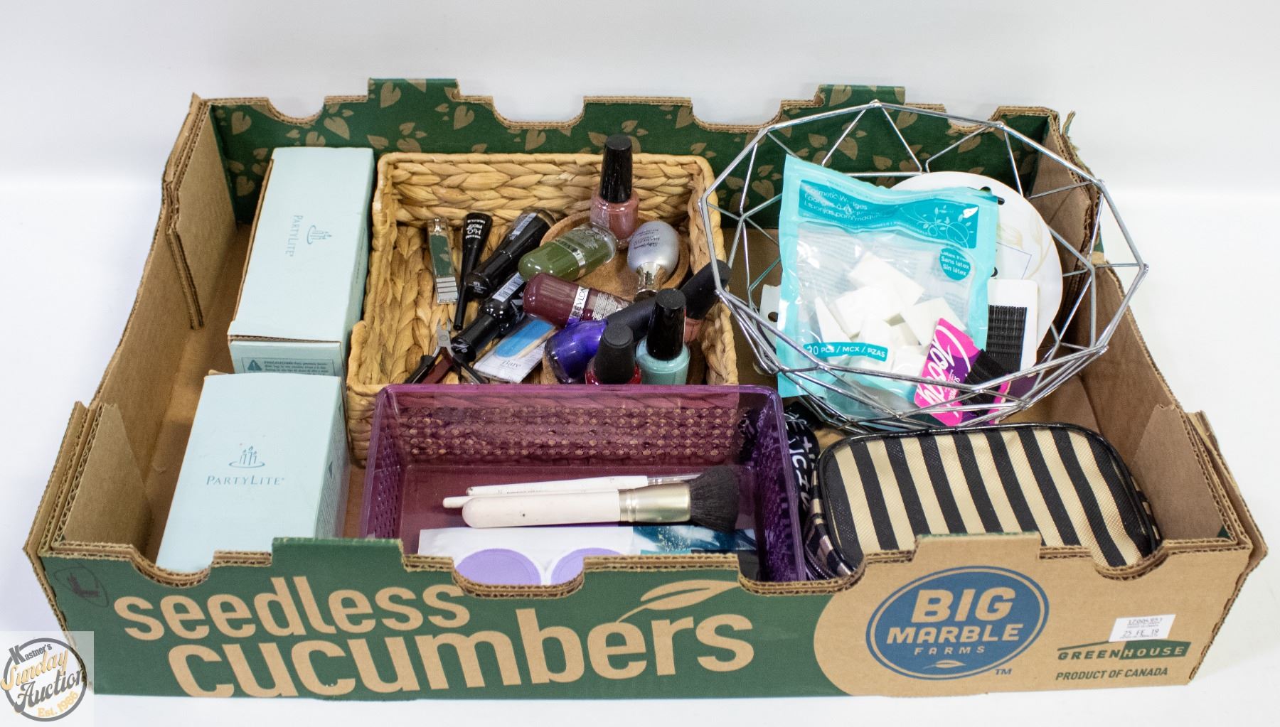 PARTYLITE CANDLES (1 LARGE & BOX WITH 3 CIRCULAR CANDLES), MAKEUP BAG, MAKEUP BRUSHES, HAND MASK, COSMETIC WEDGES, POWDER PUFFS AND MORE **ALL ITEMS MUST BE REMOVED BY 5PM SATURDAY, APRIL 4TH 2026. ALL REMAINING ITEMS WILL BE SUBJECT TO A $6.00 PER DAY STORAGE CHARGE. ANY ITEMS REMAINING AFTER MONDAY, APRIL 27TH 2026 WILL BE CONSIDERED FORFEITED. NO REFUNDS WILL BE ISSUED FOR FORFEITED ITEMS. TO SCHEDULE A PICK UP APPOINTMENT CLICK HERE