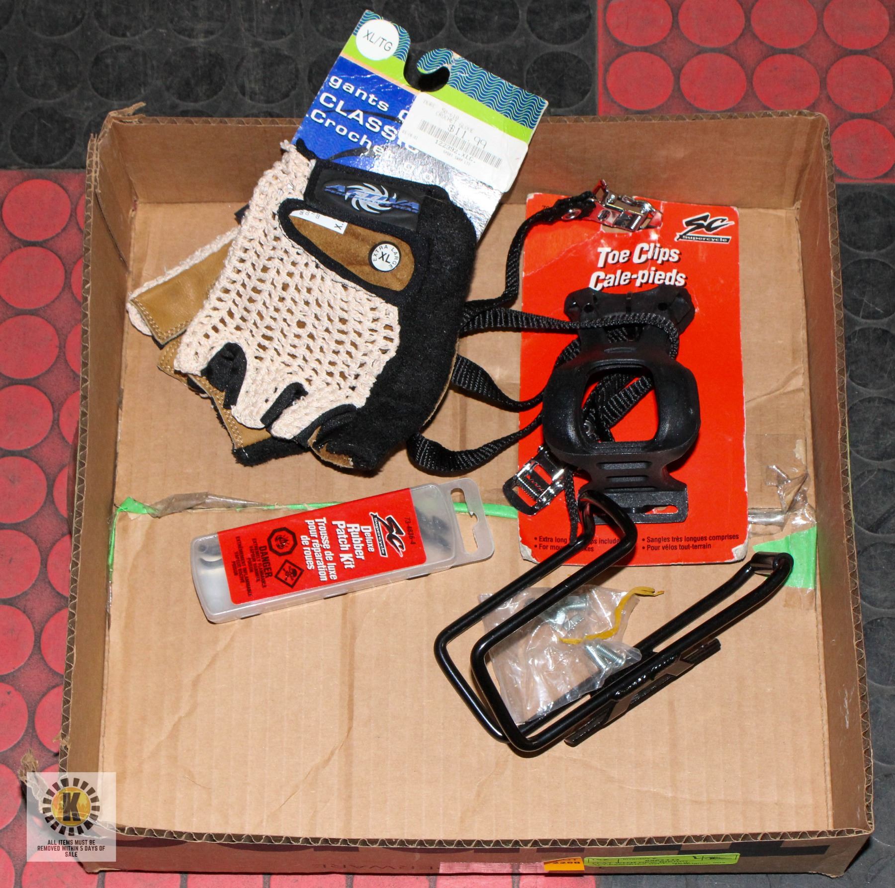 LEATHER CLASSIC CROCHET FINGERLESS GLOVES, NEW TOE CLIPS, WATER BOTTLE HOLDER, PATCH KIT **ALL ITEMS MUST BE REMOVED BY 5PM SATURDAY, APRIL 3RD 2025. ALL REMAINING ITEMS WILL BE SUBJECT TO A $6.00 PER DAY STORAGE CHARGE. ANY ITEMS REMAINING AFTER MONDAY, MAY 19TH 2025 WILL BE CONSIDERED FORFEITED. NO REFUNDS WILL BE ISSUED FOR FORFEITED ITEMS. TO SCHEDULE A PICK UP APPOINTMENT CLICK HERE
