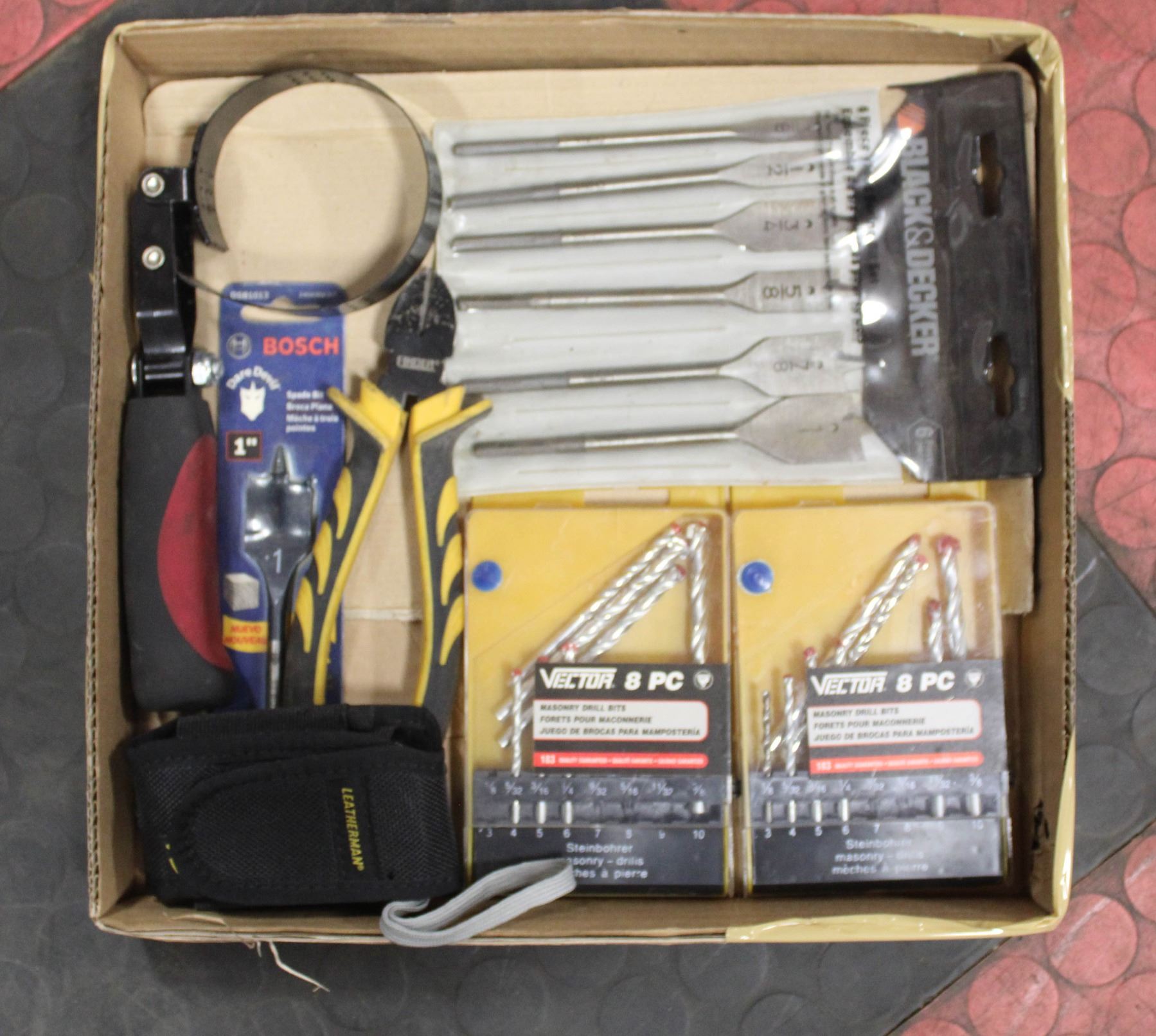 SET + NEW SEALED BOSCH 1" SPADE BIT, LEATHERMAN CLOTH POUCVH WITH FLASH-LIGHT, VECTOR MASONRY DRILL BIT SETS, FINDER WIRE CUTTERS & MOTOMASTER HAND TOOL (PIPE-CLAMP) **ALL ITEMS MUST BE REMOVED BY 5PM SATURDAY, JULY 29TH 2023. ALL REMAINING ITEMS WILL BE SUBJECT TO A $6.00 PER DAY STORAGE CHARGE. ANY ITEMS REMAINING AFTER MONDAY, AUGUST 14TH, 2023 WILL BE CONSIDERED FORFEITED. NO REFUNDS WILL BE ISSUED FOR FORFEITED ITEMS. TO SCHEDULE A PICK UP APPOINTMENT CLICK HERE