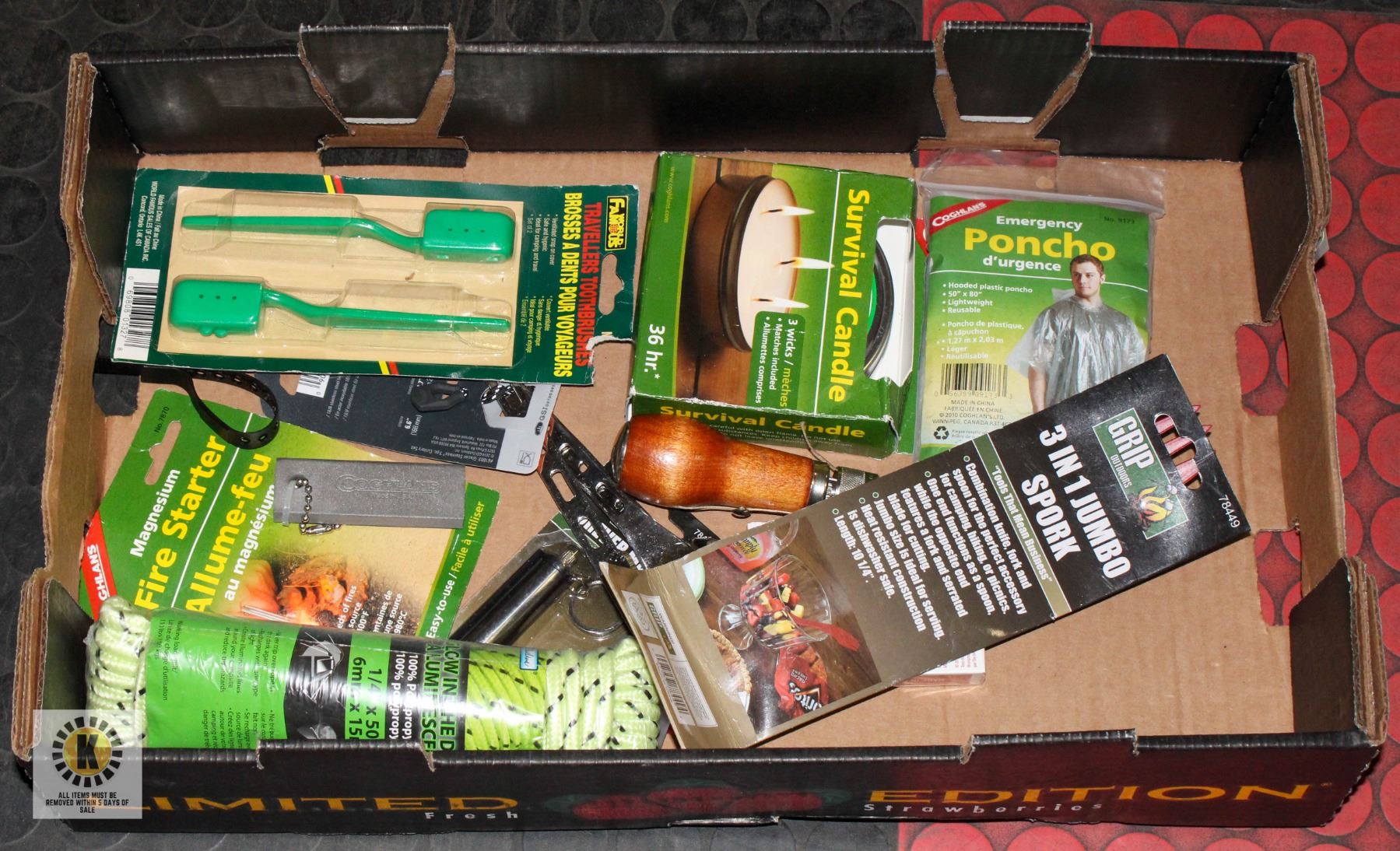 NEW MAGNESIUM FIRE STARTER, NEW GLOW IN THE DARK 50 FT. X 1/4 IN. CORD, NEW SURVIVAL CANDLE FOREVER MATCH CASE, NEW CAMP CUTLERY, NEW PLAYING CARDS, EMERGENCY PONCHO, ETC. **ALL ITEMS MUST BE REMOVED BY 5PM SATURDAY, APRIL 3RD 2025. ALL REMAINING ITEMS WILL BE SUBJECT TO A $6.00 PER DAY STORAGE CHARGE. ANY ITEMS REMAINING AFTER MONDAY, MAY 19TH 2025 WILL BE CONSIDERED FORFEITED. NO REFUNDS WILL BE ISSUED FOR FORFEITED ITEMS. TO SCHEDULE A PICK UP APPOINTMENT CLICK HERE