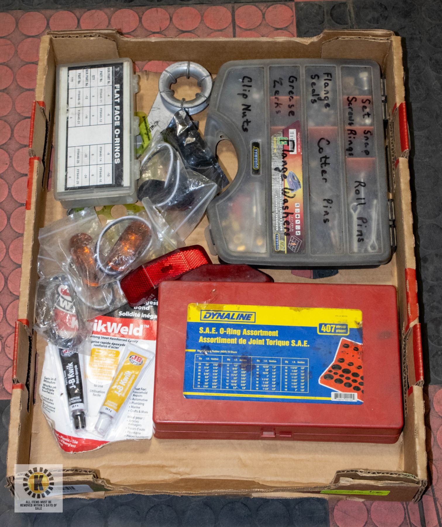 407-PIECE SAE 0-RING ASSORTMENT, FLAT FACE O-RING SORTER, DURAMAX SORTER FULL OF HARDWARE, NEW JB WELD KWIKWELD, NEW TRAILER MARKER LIGHTS, ETC. **ALL ITEMS MUST BE REMOVED BY 5PM SATURDAY, APRIL 3RD 2025. ALL REMAINING ITEMS WILL BE SUBJECT TO A $6.00 PER DAY STORAGE CHARGE. ANY ITEMS REMAINING AFTER MONDAY, MAY 19TH 2025 WILL BE CONSIDERED FORFEITED. NO REFUNDS WILL BE ISSUED FOR FORFEITED ITEMS. TO SCHEDULE A PICK UP APPOINTMENT CLICK HERE