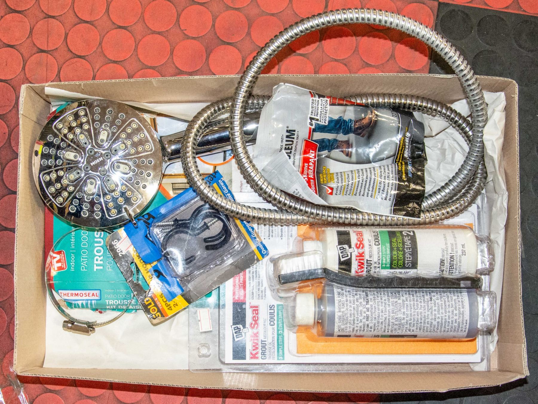 KWIK SEAL GROUT RECOLOR KIT, NEW RUSTOLEUM ANTI-SKID PAINT ADDITIVE, PATIO DOOR INSULATION, MOEN MULTI-PULSE SHOWERHEAD WITH METAL WATER LINE AND CONNECTOR, ETC. **ALL ITEMS MUST BE REMOVED BY 5PM MONDAY, NOVEMBER 7TH, 2022. ALL REMAINING ITEMS WILL BE SUBJECT TO A $6.00 PER DAY STORAGE CHARGE. ANY ITEMS REMAINING AFTER MONDAY, NOVEMBER 28, 2022 WILL BE CONSIDERED FORFEITED. NO REFUNDS WILL BE ISSUED FOR FORFEITED ITEMS. TO SCHEDULE A PICK UP APPOINTMENT CLICK HERE
