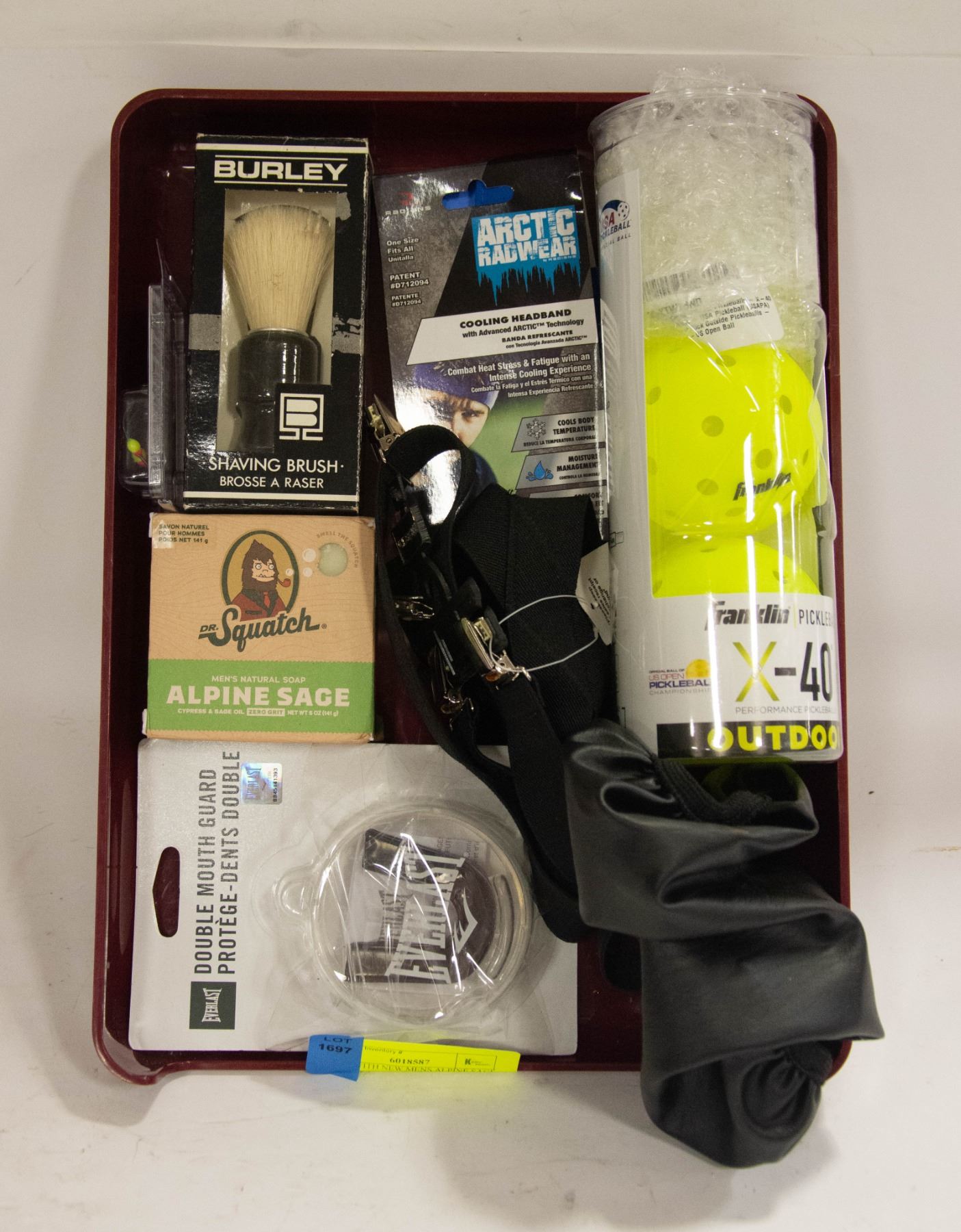 NEW BURLEY SHAVING BRUSH, NEW ARCTIC RADWEAR COOLING HEADBAND, NEW EVERLAST DOUBLE MOUTH GUARD, PLEATHER BICYCLE SEAT COVER UNUSED, AND NEW SUSPENDERS **ALL ITEMS MUST BE REMOVED BY 5PM SATURDAY, OCTOBER 19TH 2024. ALL REMAINING ITEMS WILL BE SUBJECT TO A $6.00 PER DAY STORAGE CHARGE. ANY ITEMS REMAINING AFTER MONDAY, NOVEMBER 4TH 2024 WILL BE CONSIDERED FORFEITED. NO REFUNDS WILL BE ISSUED FOR FORFEITED ITEMS. TO SCHEDULE A PICK UP APPOINTMENT CLICK HERE