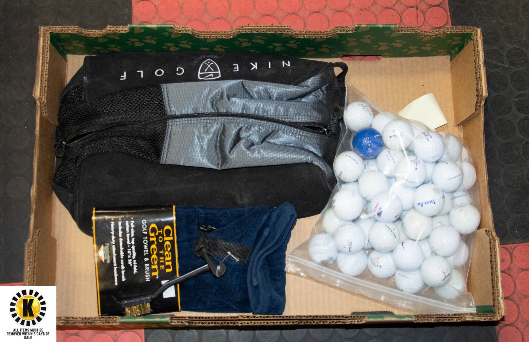 THE GREEN" TOWEL AND BRUSH SET, BAG WITH L18 GOLF BALLS INCL. CALLOWAY, TITLEIST, PINNACLE, ETC. **ALL ITEMS MUST BE REMOVED BY 5PM SATURDAY, APRIL 22ND, 2023. ALL REMAINING ITEMS WILL BE SUBJECT TO A $6.00 PER DAY STORAGE CHARGE. ANY ITEMS REMAINING AFTER MONDAY, MAY 8TH, 2023 WILL BE CONSIDERED FORFEITED. NO REFUNDS WILL BE ISSUED FOR FORFEITED ITEMS.** TO SCHEDULE A PICK UP APPOINTMENT CLICK HERE