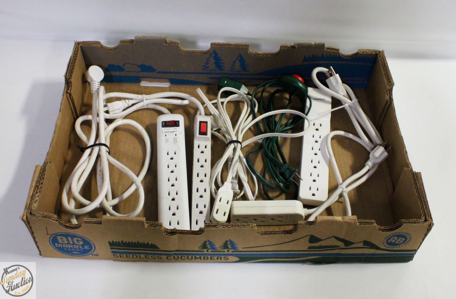 CORDS INCL. DEFIANT 6-TAP SURGE PROTECTED POWERVAR, SLIM 6-TAP PROTECTED AND STAPLES 6-TAP POWER BARS, 10 FT. GREEN "TREE CORD" WITH LARGE PUSHBUTTON SWITCH, 4 FT. 3-TAP AND 12 FT. 3-TAP CORDS **ALL ITEMS MUST BE REMOVED BY 5PM SATURDAY, NOVEMBER 29TH 2025. ALL REMAINING ITEMS WILL BE SUBJECT TO A $6.00 PER DAY STORAGE CHARGE. ANY ITEMS REMAINING AFTER MONDAY, DECEMBER 15TH 2025 WILL BE CONSIDERED FORFEITED. NO REFUNDS WILL BE ISSUED FOR FORFEITED ITEMS. TO SCHEDULE A PICK UP APPOINTMENT CLICK HERE