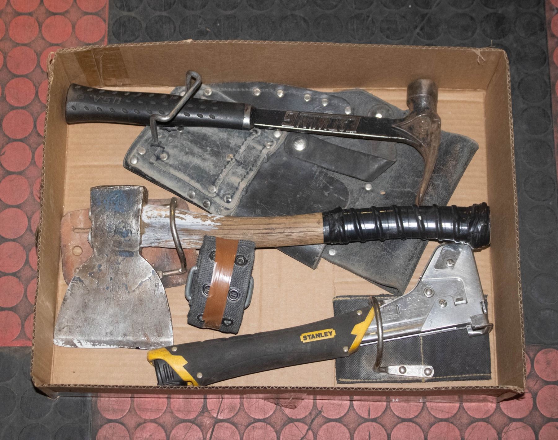 INCL. ESTWING FRAMING HAMMER WITH BELT SHEATH, H.B. HAMMER AXE (MADE IN SWEDEN) WITH BELT HANGER, STANLEY HAMMER STAPLER WITH BELT HANGER **ALL ITEMS MUST BE REMOVED BY 5PM SATURDAY, MAY 11THTH 2024. ALL REMAINING ITEMS WILL BE SUBJECT TO A $6.00 PER DAY STORAGE CHARGE. ANY ITEMS REMAINING AFTER MONDAY, MAY 27TH 2024 WILL BE CONSIDERED FORFEITED. NO REFUNDS WILL BE ISSUED FOR FORFEITED ITEMS. TO SCHEDULE A PICK UP APPOINTMENT CLICK HERE