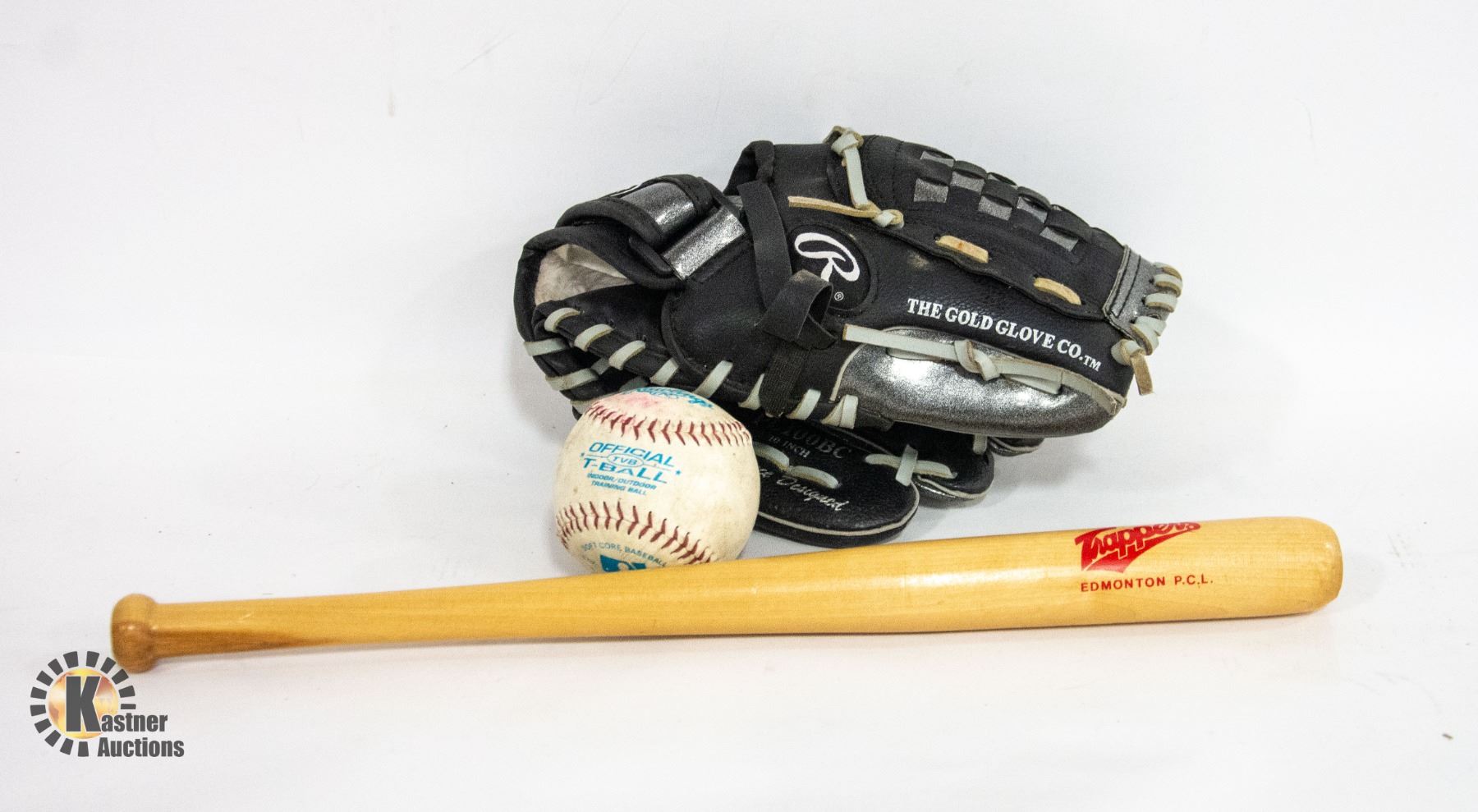 GLOVE WITH T-BALL BASEBALL AND VINTAGE EDMONTON TRAPPERS MINI BAT **ALL ITEMS MUST BE REMOVED BY 5PM SATURDAY, JUNE 1ST 2024. ALL REMAINING ITEMS WILL BE SUBJECT TO A $6.00 PER DAY STORAGE CHARGE. ANY ITEMS REMAINING AFTER MONDAY, JUNE 17TH 2024 WILL BE CONSIDERED FORFEITED. NO REFUNDS WILL BE ISSUED FOR FORFEITED ITEMS. TO SCHEDULE A PICK UP APPOINTMENT CLICK HERE