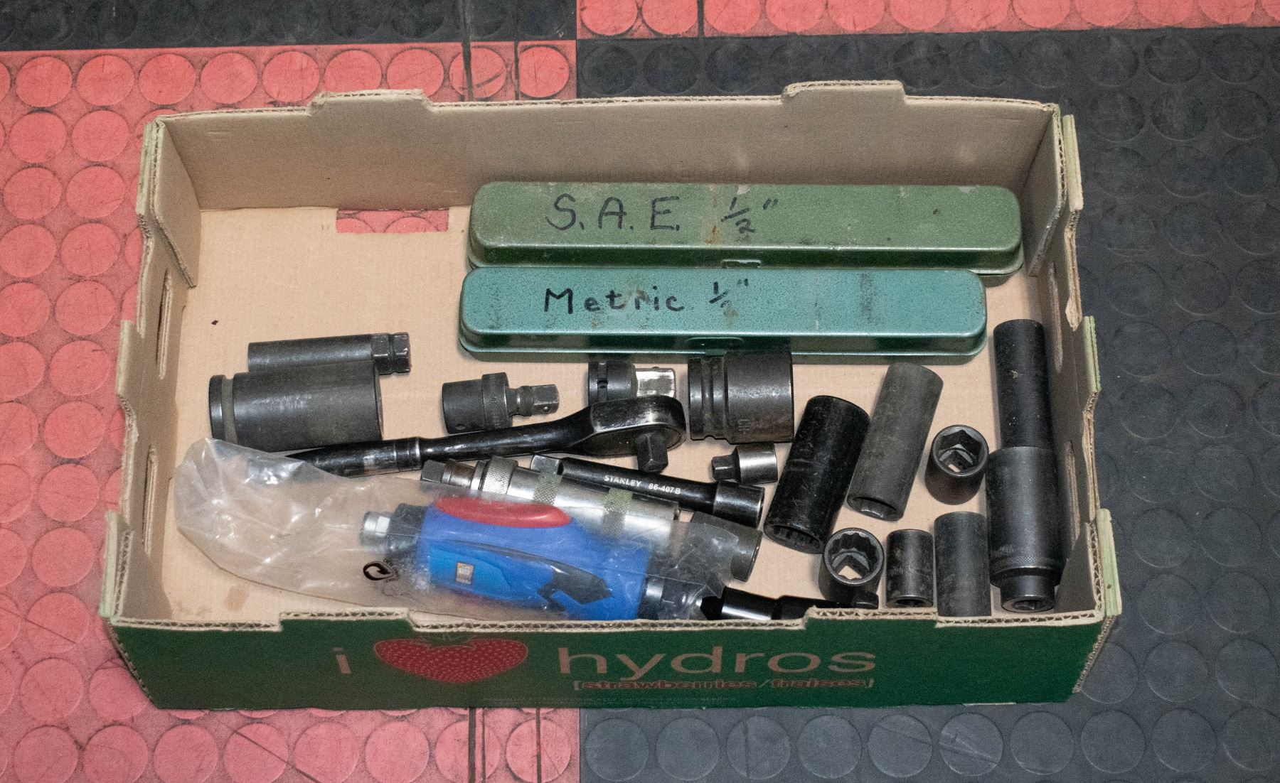 SOCKET SETS WITH ADDITIONAL 3/4" DRIVE TRANSITION AND SEVERAL 3/4" LARGE SOCKETS, INCLUDES NEW POWERFIST 1/2" DRIVE AIR RATCHET, LOTS OF ADDITIONAL SOCKETS AND ACCESSORIES **ALL ITEMS MUST BE REMOVED BY 5PM SATURDAY, MAY 10TH 2025. ALL REMAINING ITEMS WILL BE SUBJECT TO A $6.00 PER DAY STORAGE CHARGE. ANY ITEMS REMAINING AFTER MONDAY, MAY 26TH 2025 WILL BE CONSIDERED FORFEITED. NO REFUNDS WILL BE ISSUED FOR FORFEITED ITEMS. TO SCHEDULE A PICK UP APPOINTMENT CLICK HERE