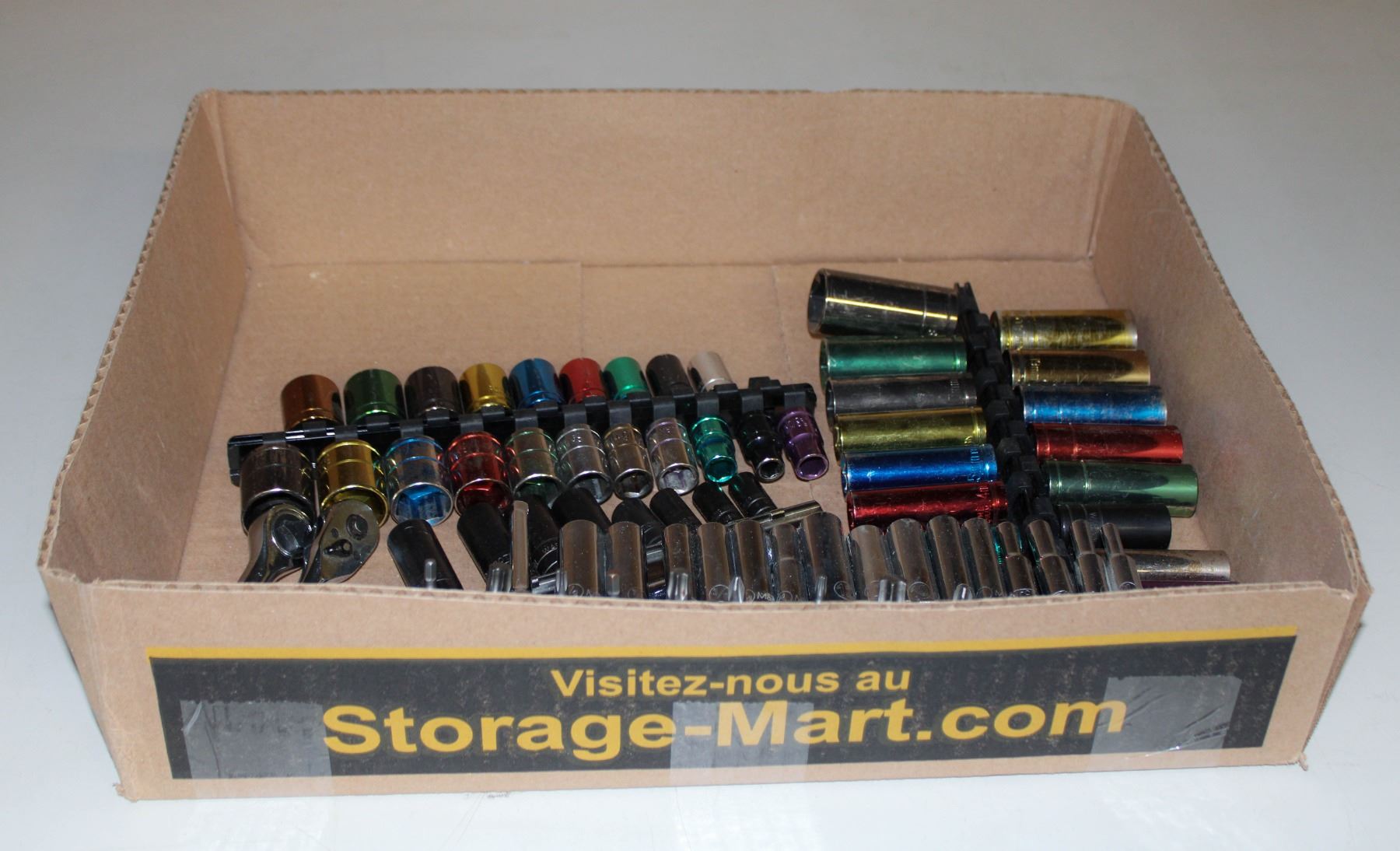 SORTING RACKS - 3/8" AND 1/4" DRIVE, DEEP SOCKETS, STANDARD SOCKETS, ASSORTMENT OF BIT DRIVERS, RATCHETS AND EXTENSIONS, 86 PIECES IN TOTAL **ALL ITEMS MUST BE REMOVED BY 5PM SATURDAY, MARCH 1ST 2025. ALL REMAINING ITEMS WILL BE SUBJECT TO A $6.00 PER DAY STORAGE CHARGE. ANY ITEMS REMAINING AFTER MONDAY, MARCH 17TH 2025 WILL BE CONSIDERED FORFEITED. NO REFUNDS WILL BE ISSUED FOR FORFEITED ITEMS. TO SCHEDULE A PICK UP APPOINTMENT CLICK HERE