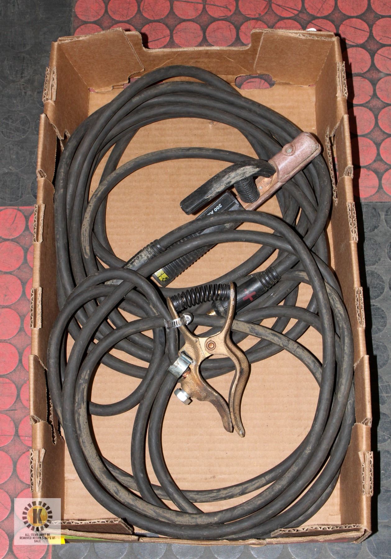 HEAVY GAUGE CABLES WITH QUALITY GROUND CLAMP AND DIODE HOLDER **ALL ITEMS MUST BE REMOVED BY 5PM SATURDAY, APRIL 3RD 2025. ALL REMAINING ITEMS WILL BE SUBJECT TO A $6.00 PER DAY STORAGE CHARGE. ANY ITEMS REMAINING AFTER MONDAY, MAY 19TH 2025 WILL BE CONSIDERED FORFEITED. NO REFUNDS WILL BE ISSUED FOR FORFEITED ITEMS. TO SCHEDULE A PICK UP APPOINTMENT CLICK HERE